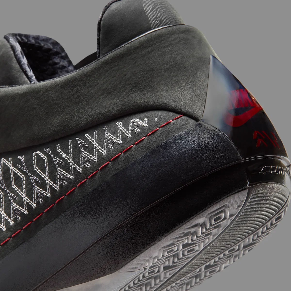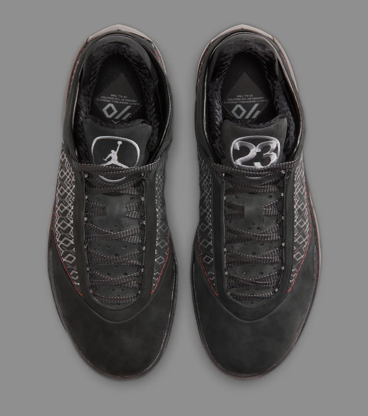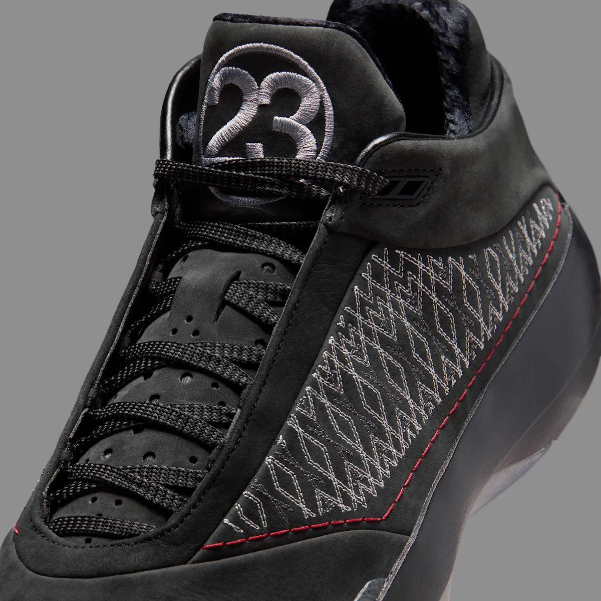 The upper of this sneaker is designed with black premium leather. From the sides of the AJ23, it features AJ23 DNA stitching which resembles the DNA helix pattern. Stitching down the side is a signifier of Jordan’s DNA. The upper is then cut off by some red accents above the midsole. At the tongue, there is an embroidered “23” logo with the Jumpman logo for an elevated two-toned effect.