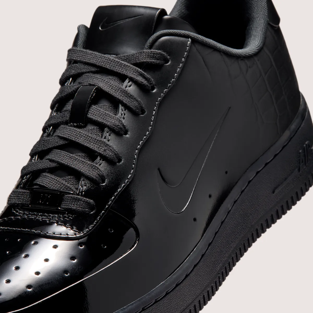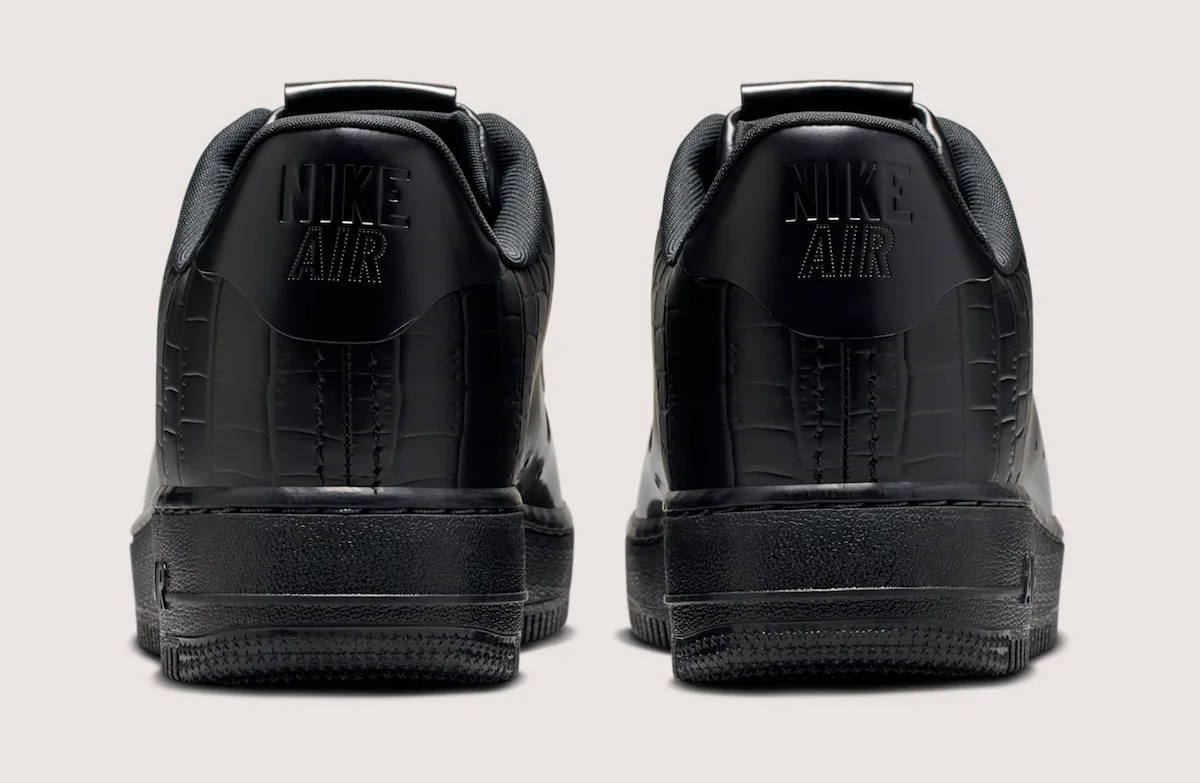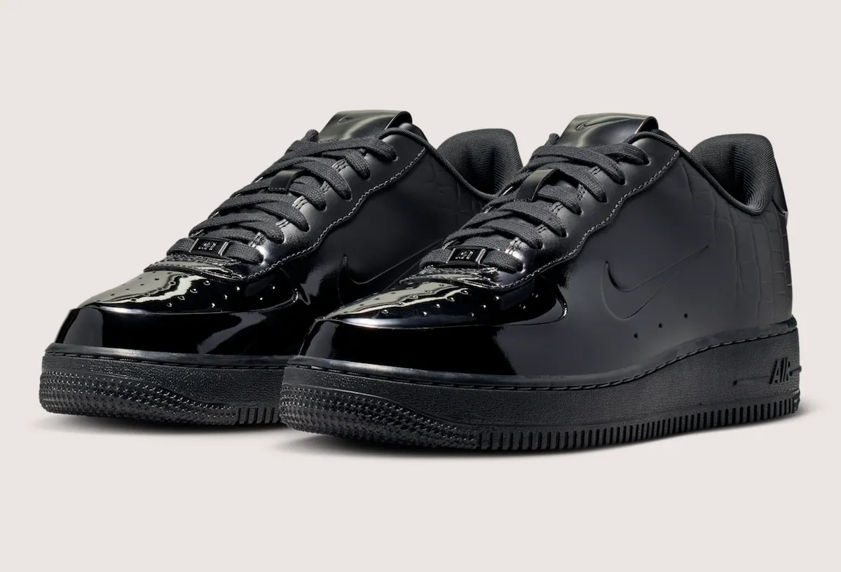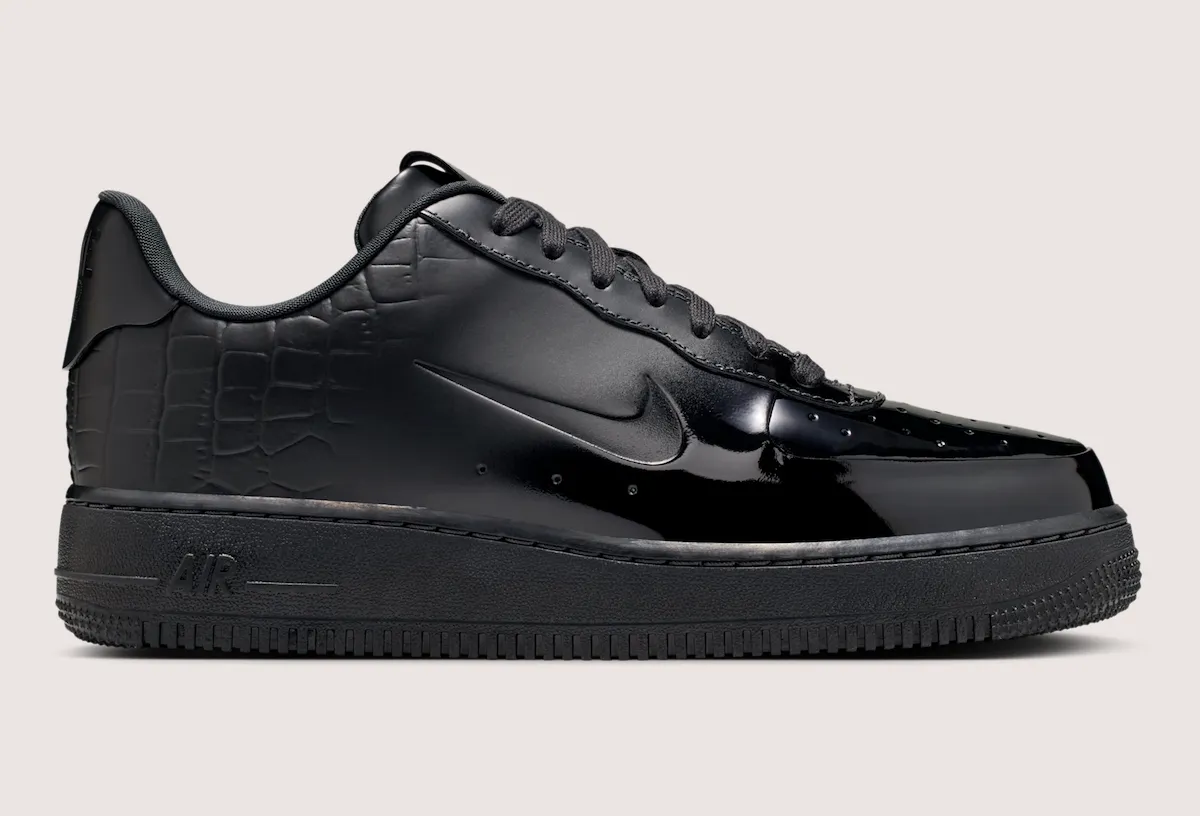 Glossy “Black” and “College Grey” patent leather dominates, but the construction is what shifts the conversation. Instead of stacked panels, the toe, sidewall, and heel flow as a single, clean piece, interrupted only by tiny debossed Swooshes and a stitch-free back tab. A subtle croc embossing appears toward the rear, recalling the sought-after 2007 “Crocodile” edition without trying to replicate it, while an all-black leather tongue and toe keep the look disciplined.