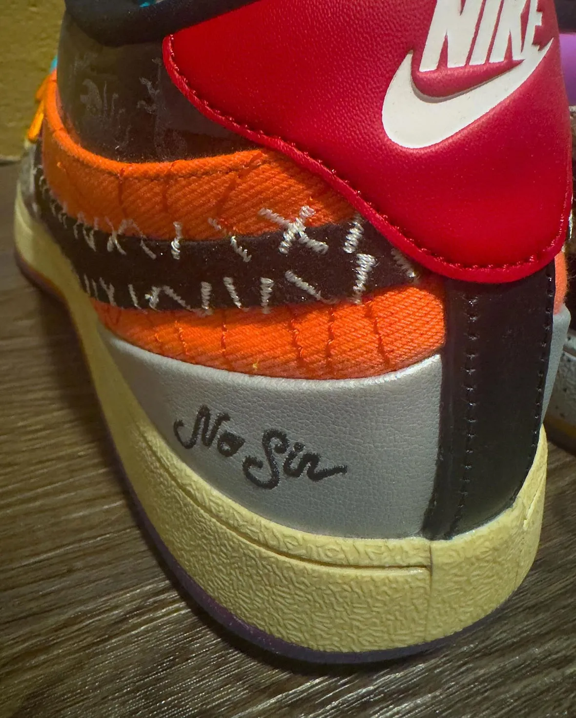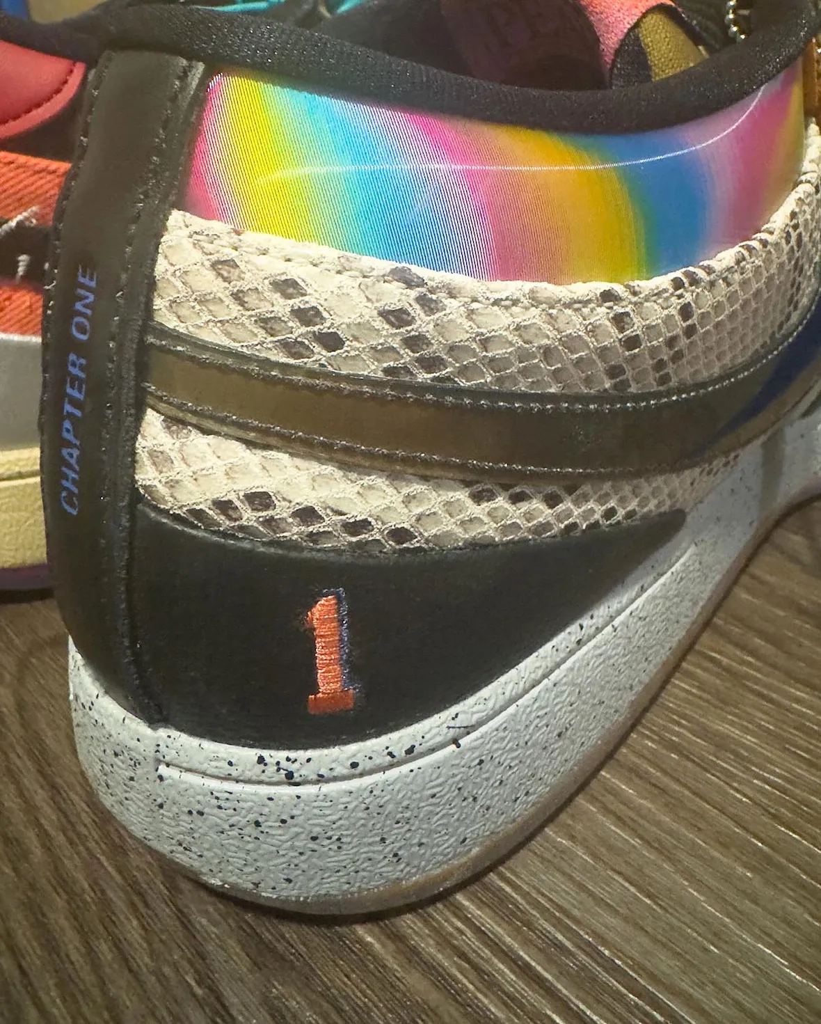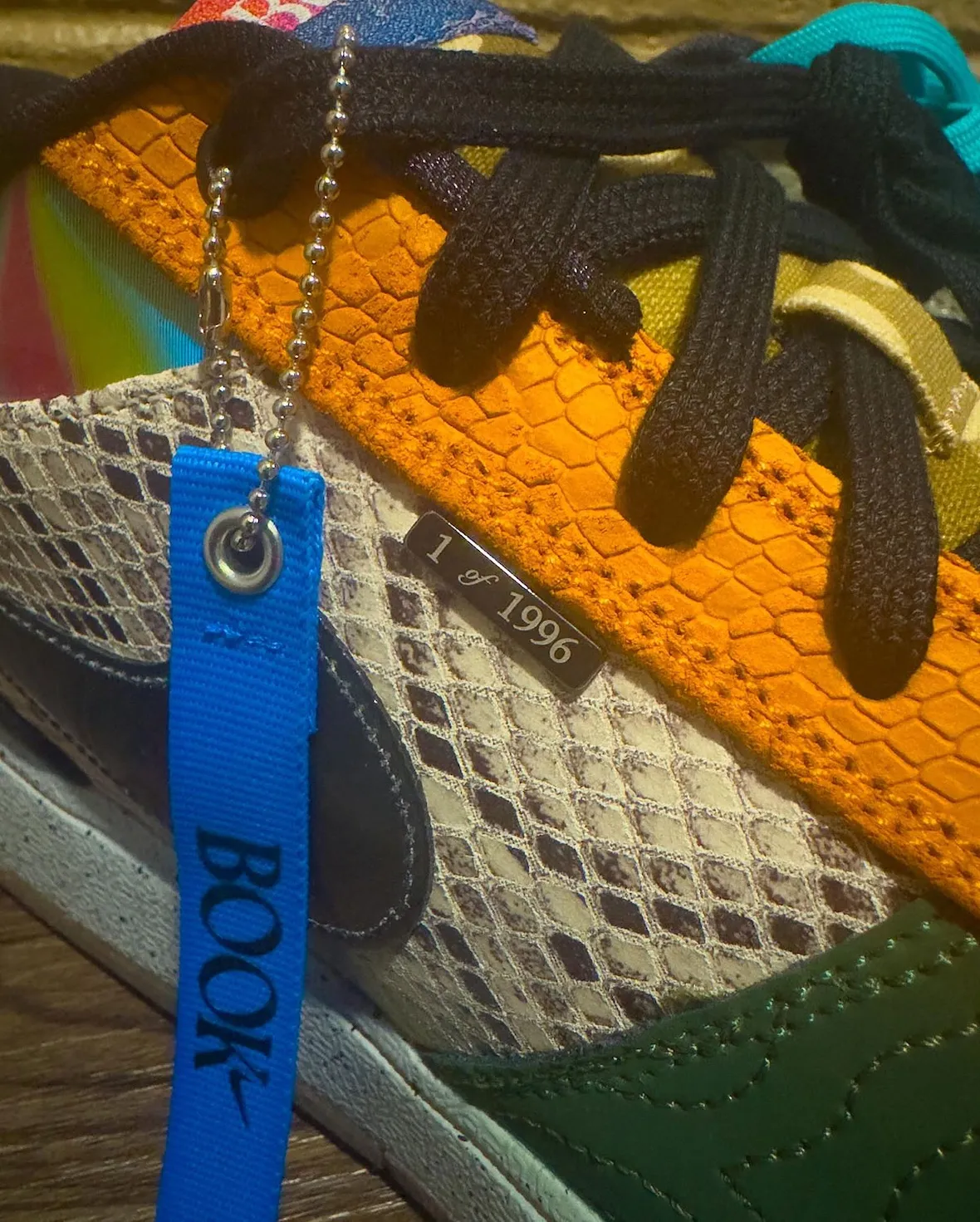 The left shoe pulls details from Safari mudguards, Chevy-inspired golden suede toes, Sedona graphics, reptile textures, and Halloween stitching. It even features nods to the ’95 All-Star laces, “Moss Point” lettering, and a Sunset outsole. The right shoe carries denim panels from “Blue Blood,” Flagstaff map prints, Desert Camo tongues, rainbow collars, and snakeskin overlays, all tied together with a “1 of 1996” heel tag. That’s the detail collectors will remember most.