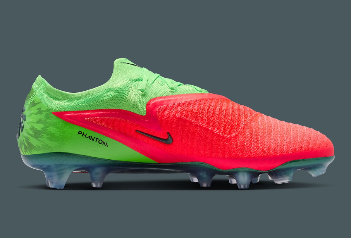 Erling Haaland’s newest Nike Phantom 6 Low PE goes hard on color, teaming Hot Punch with Green Strike. The combo has already earned a “watermelon” nickname from fans on social media. The contrast between the pink-red forefoot and vibrant green collar and heel gives the shoe explosive energy. Black trim around the Swoosh, heel overlay and branding helps add definition to the look.