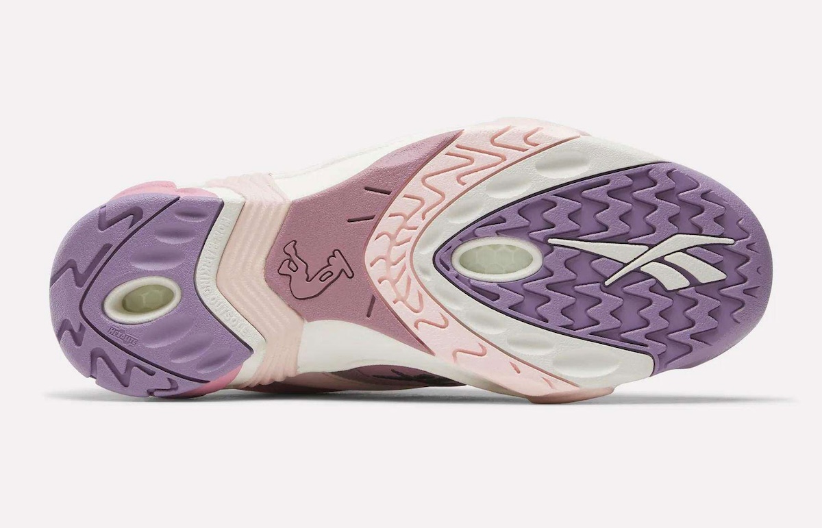 Underneath, the outsole mixes mauve, purple, pink, and cream with zigzag traction and visible Hexalite cushioning windows. It is a softer take, no question, but the shoe still has presence.