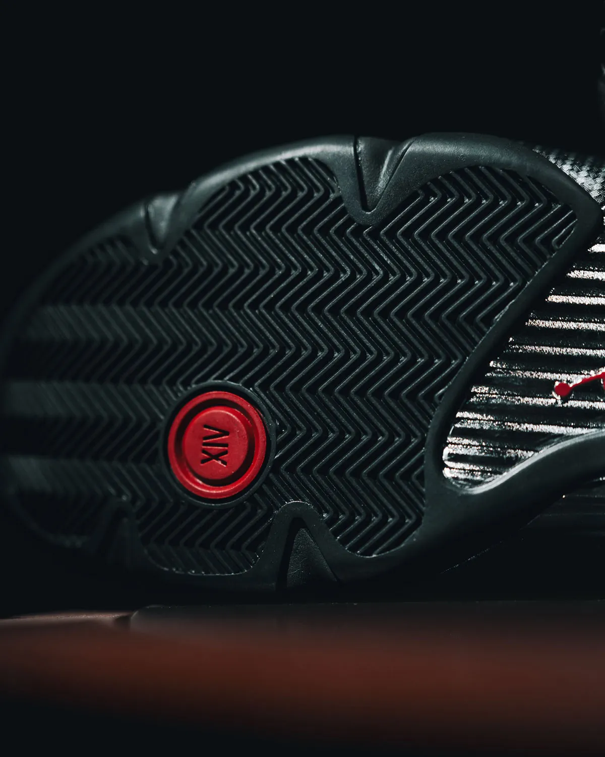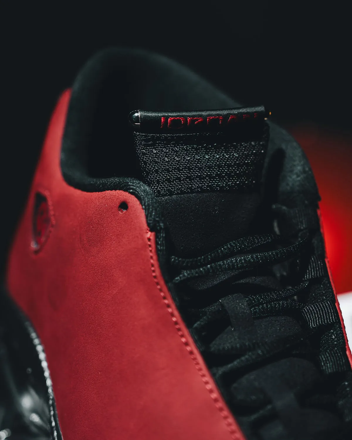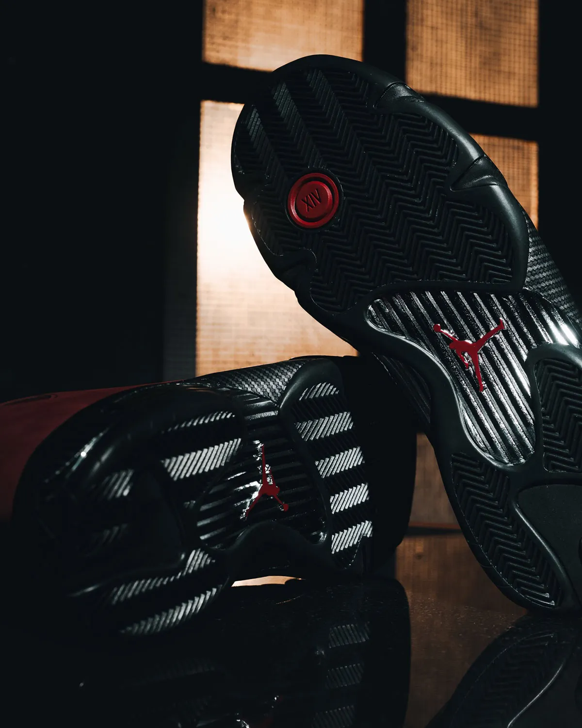 Black detailing sharpens the look across the tongue, inner lining, midsole, and carbon fiber-inspired trim, giving the pair a familiar feel for anyone who remembers the “Ferrari” Air Jordan 14. Jordan Brand also swaps in Oklahoma flavor through the badge near the collar, where the interlocking OU logo replaces the usual emblem. Red Jumpman hits on the outsole and heel keep the color balance right in line with the school’s identity.