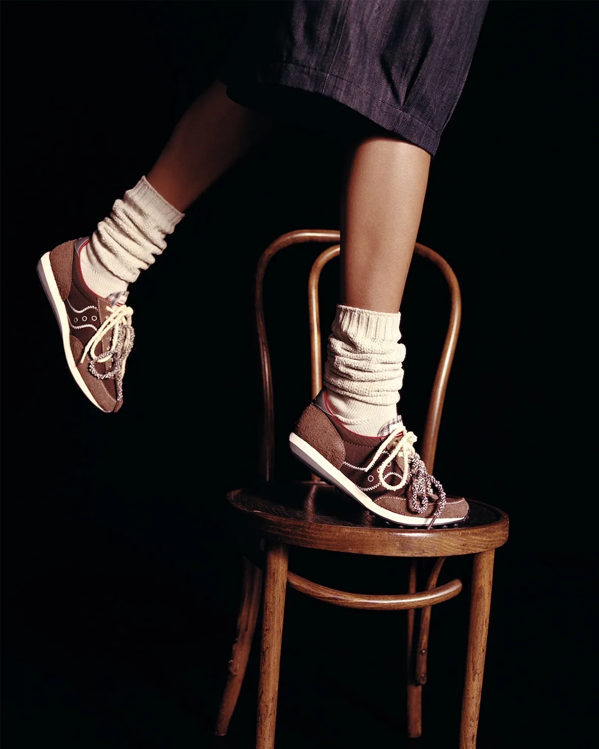 Small details carry the collaboration without overwhelming it. Zig-zag stitching, contrast trim, a hand-drawn river logo, and a vintage-style co-branded tongue tag all add character in a controlled way. Saucony and Estudio Niksen also include interchangeable laces and a custom sockliner, giving the release a little more flexibility without changing its calm design language.