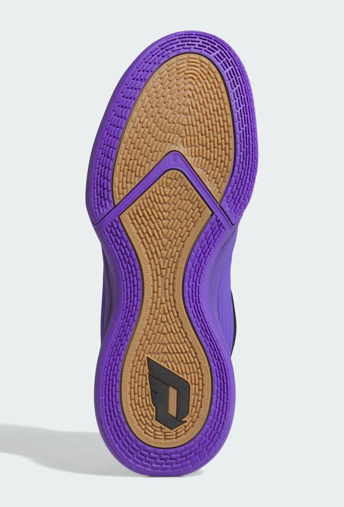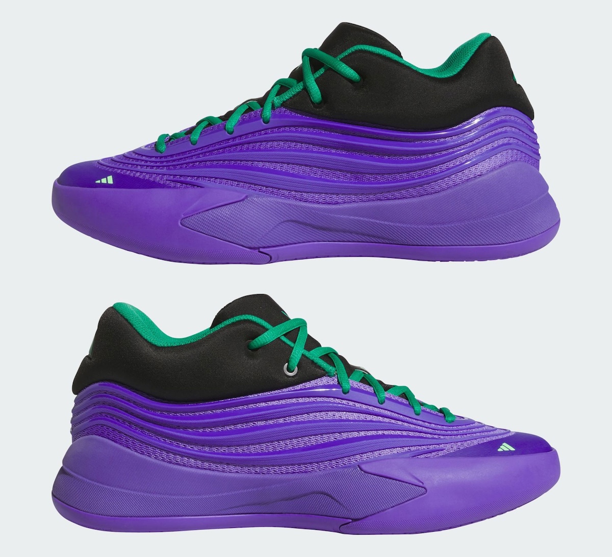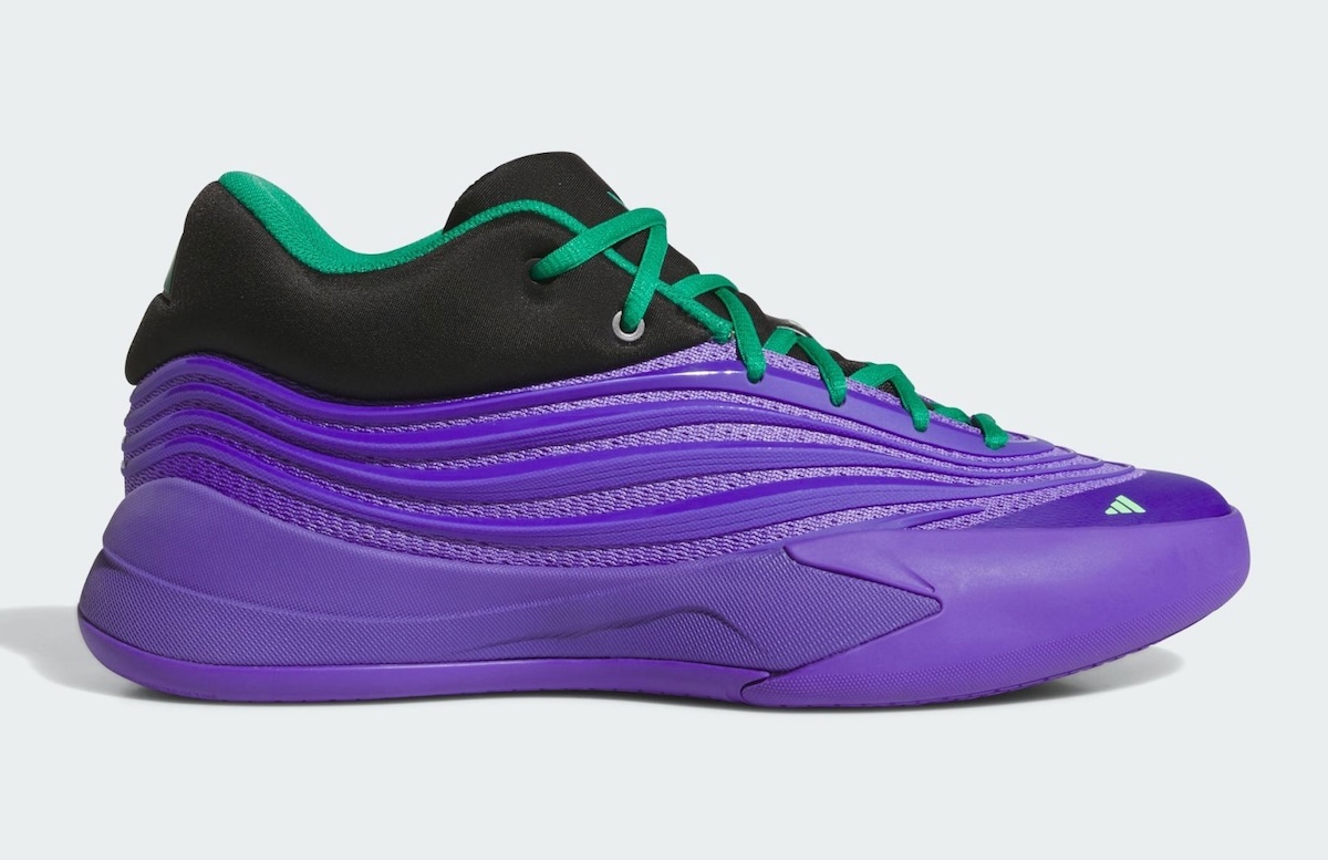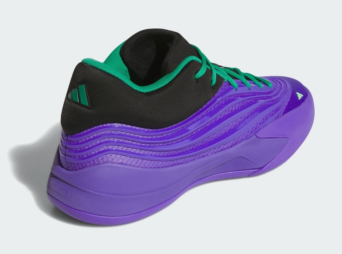 Bold purple base colour with swoosh-like paneling and neon green laces are balanced out by black around the collar and tongue. Sleek adidas accents hit the forefoot and heel. Dame’s signature “D” logo are visible on the insole and outsole.
