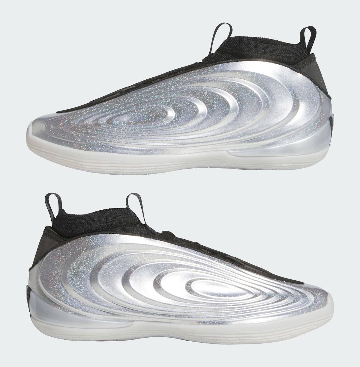 Its upper uses a smooth chrome shell that wraps the toe and flows across the rippled side panels. When light hits the shoe, a hidden layer of rainbow glitter shines through the silver coat, giving the colorway a subtle burst of energy.