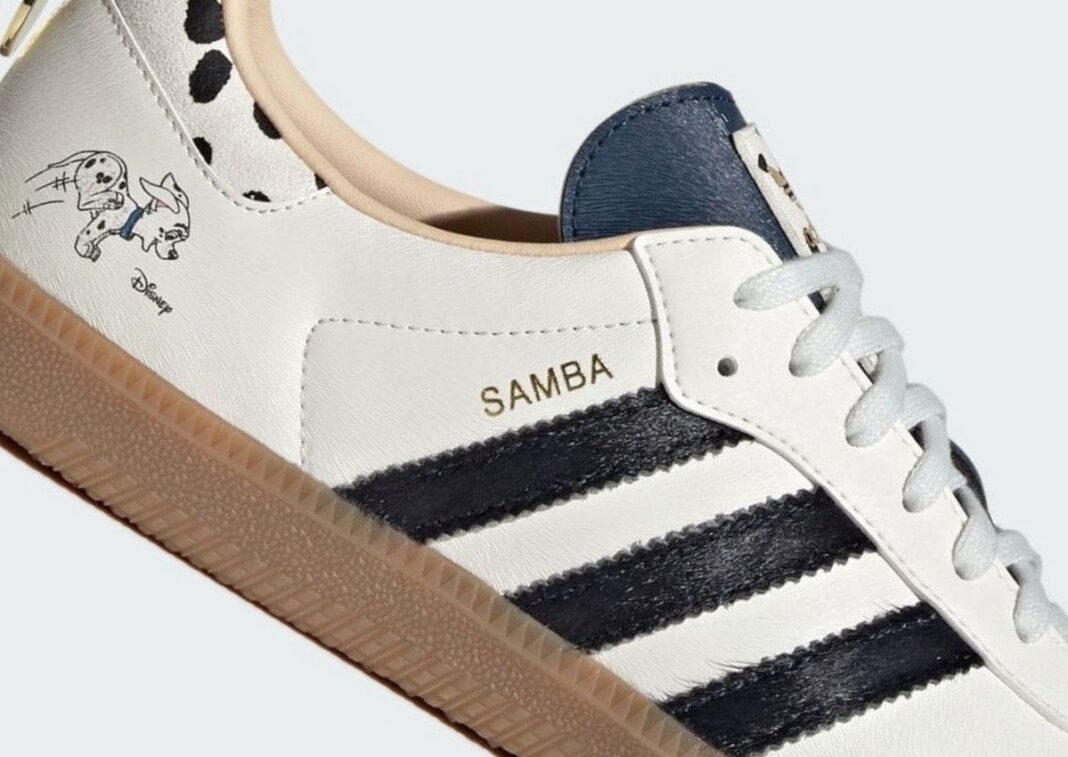 The 101 Dalmatians x adidas Samba “Penny” releases in July 2025 for $120 USD, available through adidas.com and select sneaker shops.