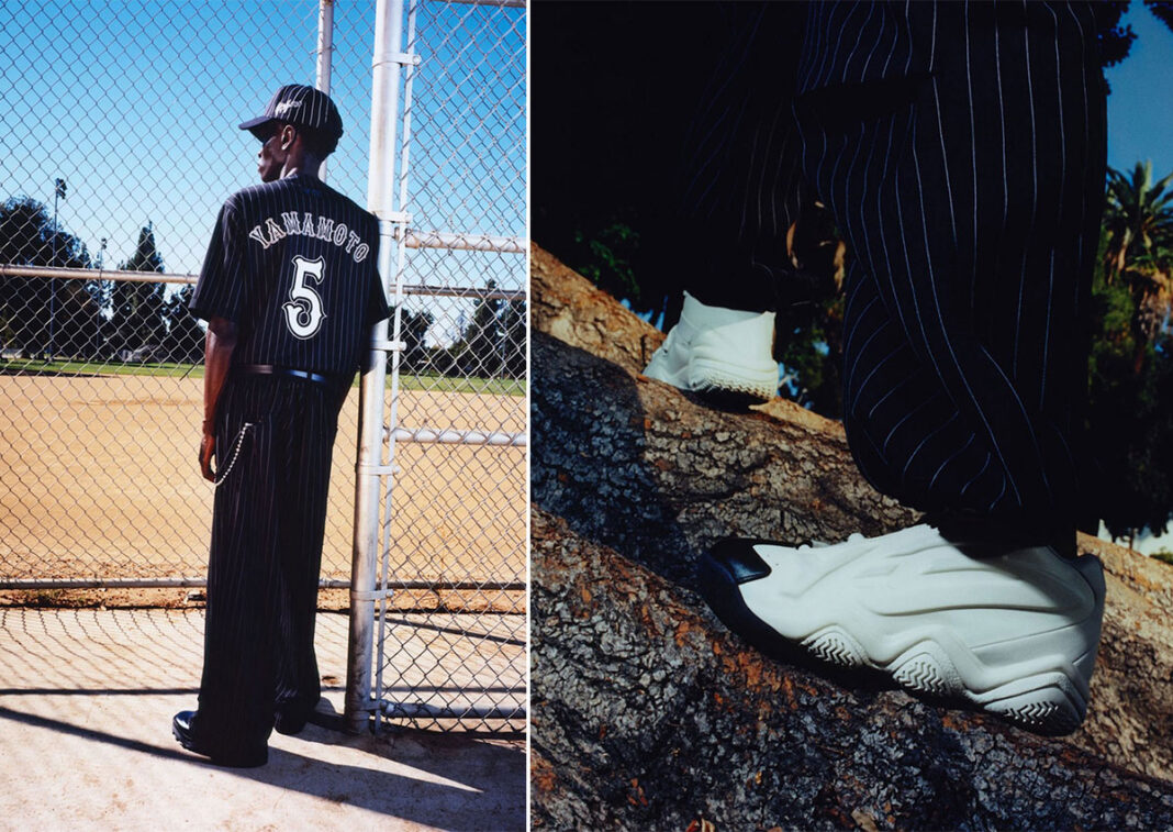 Deep navy pinstripe forms a visual through line from jerseys to warm ups to oversized suiting. The recurring element bookends a five-piece jersey pack centered around players synonymous with the number 5: soccer’s Zinedine Zidane and Jude Bellingham, basketball’s Anthony Edwards, football’s Garrett Wilson and Yohji Yamamoto himself wearing a Yomiuri Giants–inspired baseball jersey. The styling quietly nods towards Y-3’s gradual migration towards more obvious, legible sportswear inspiration.