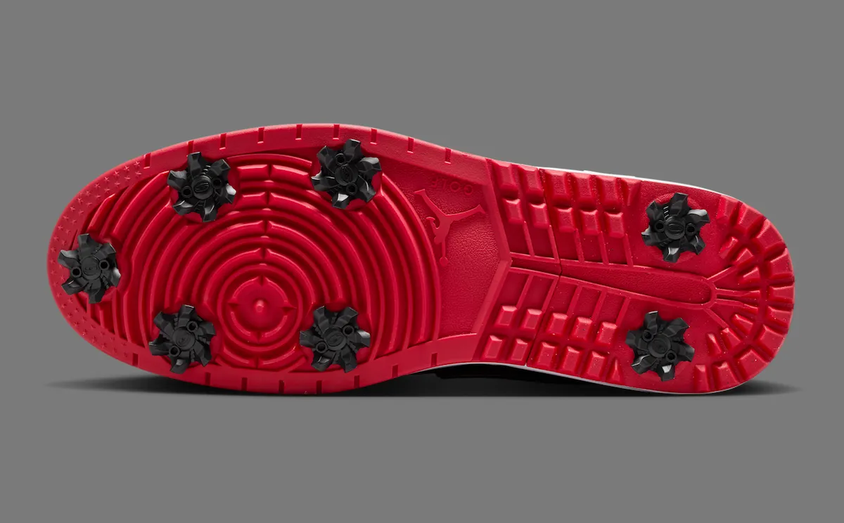 For the first time, the Air Jordan 1 Golf will feature a spiked outsole. A series of seven removable plastic spikes nestle into an aggressive traction pattern, engineered to provide increased grip through the full swing and on uneven lies. That transformation brings the model more in line with traditional golf footwear while still maintaining its crossover style.