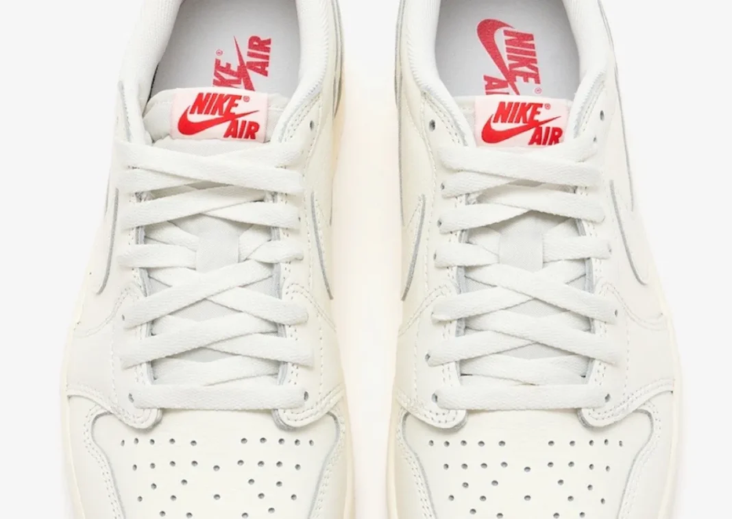 Now, Jordan Brand is revisiting that same formula on the low-top version. Early retailer images show a nearly all-Sail upper that stays true to the original look. In addition, the only strong contrast appears on the tongue tag, where a hit of University Red adds a small but important pop.