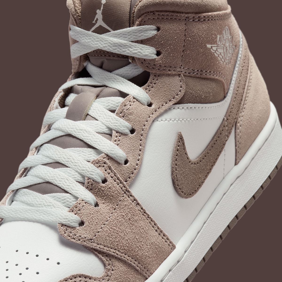 Olive Grey shows up on the suede Swoosh, deep enough to stand out without breaking the neutral flow. The same tone appears on the outsole, sitting under a white midsole that keeps everything balanced. White laces, a stamped Wings logo at the collar, and a tonal Jumpman on the tongue round things out without overcomplicating the design.