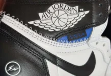 This mid-top Air Jordan 1 comes constructed in a mix of leather and patent leather with mesh material used on the collar. “Bred” toe box, stitched Swooshes on the sides, enlarged heel pull tabs with a “23” logo stitched on the bottom atop a White midsole and Black rubber outsole completes the design.