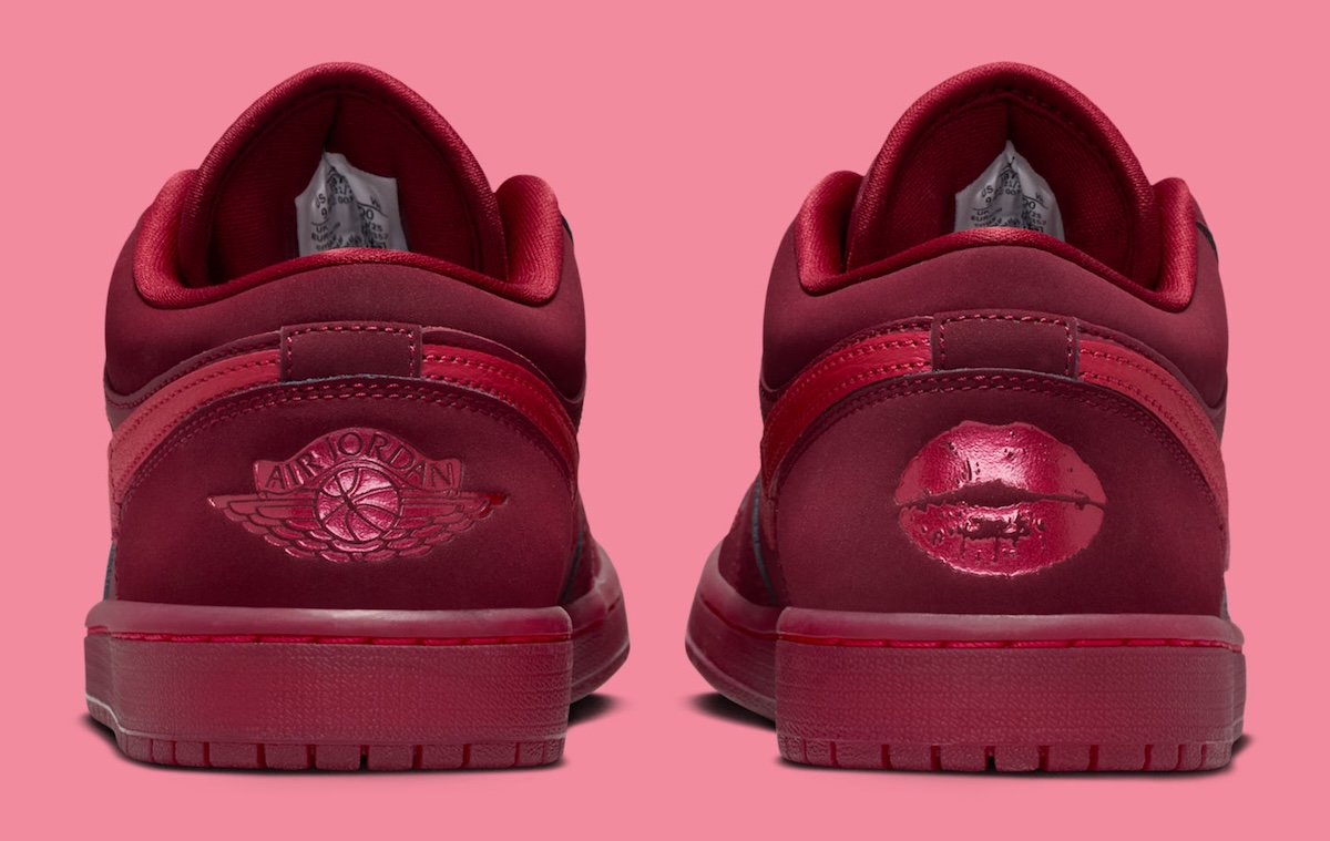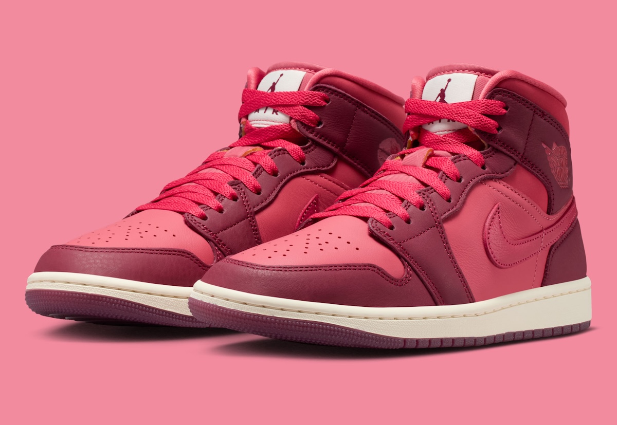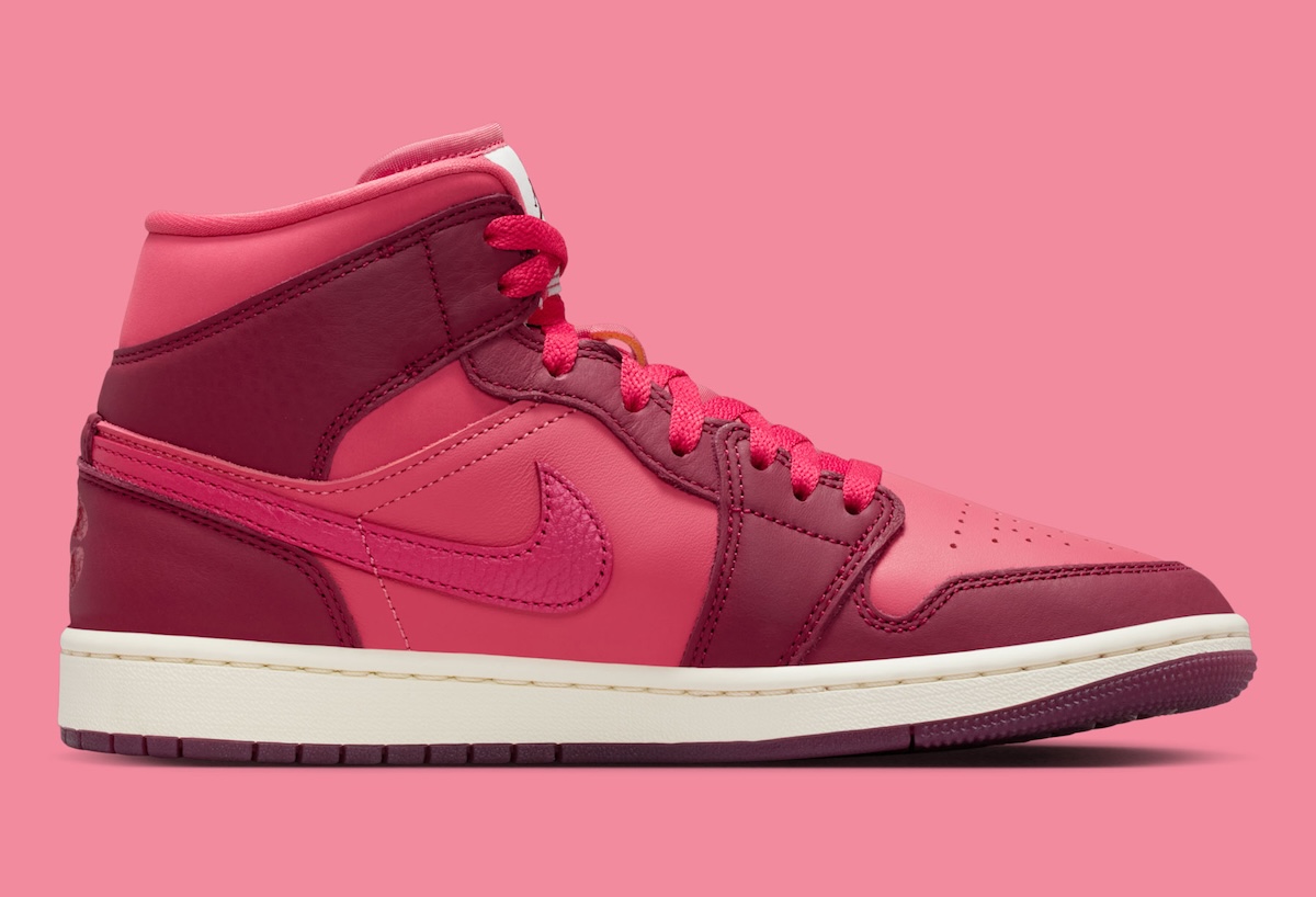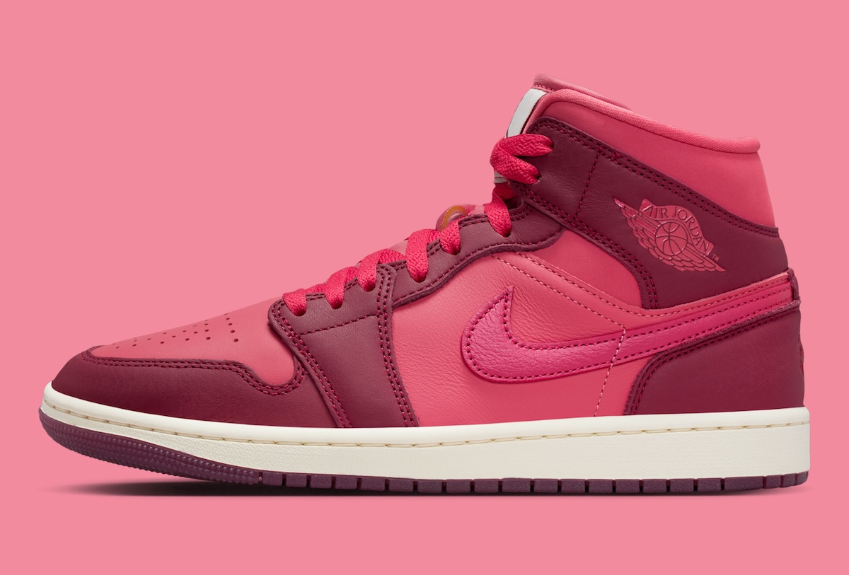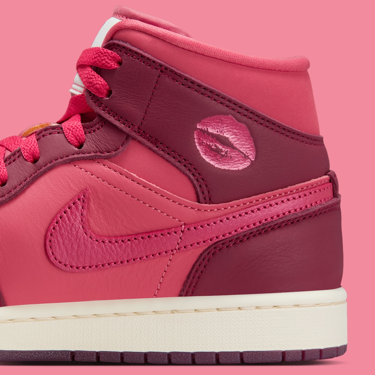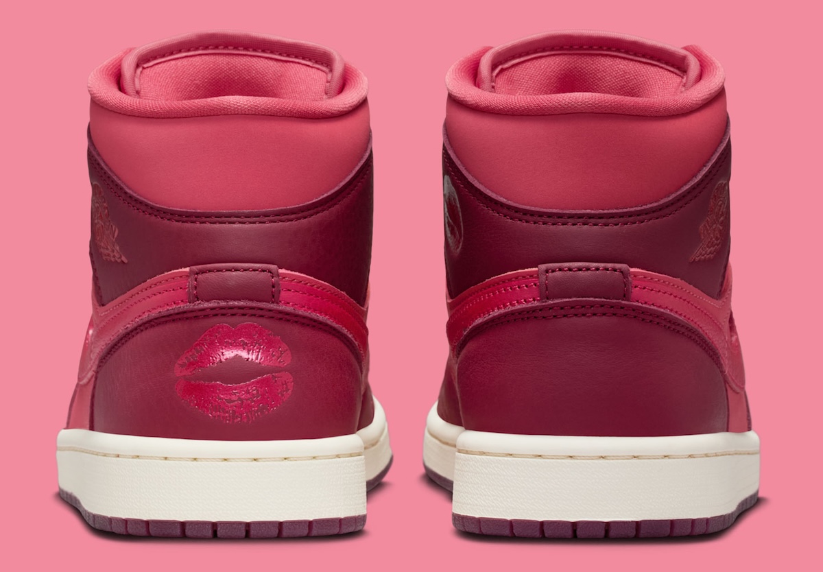 The Air Jordan 1 Mid shifts into lighter territory. Burgundy panels mix with brighter pink-red sections that change the mood completely. The white midsole and tongue tag help calm the colors. The lipstick kiss on the ankle adds character without overwhelming the design.