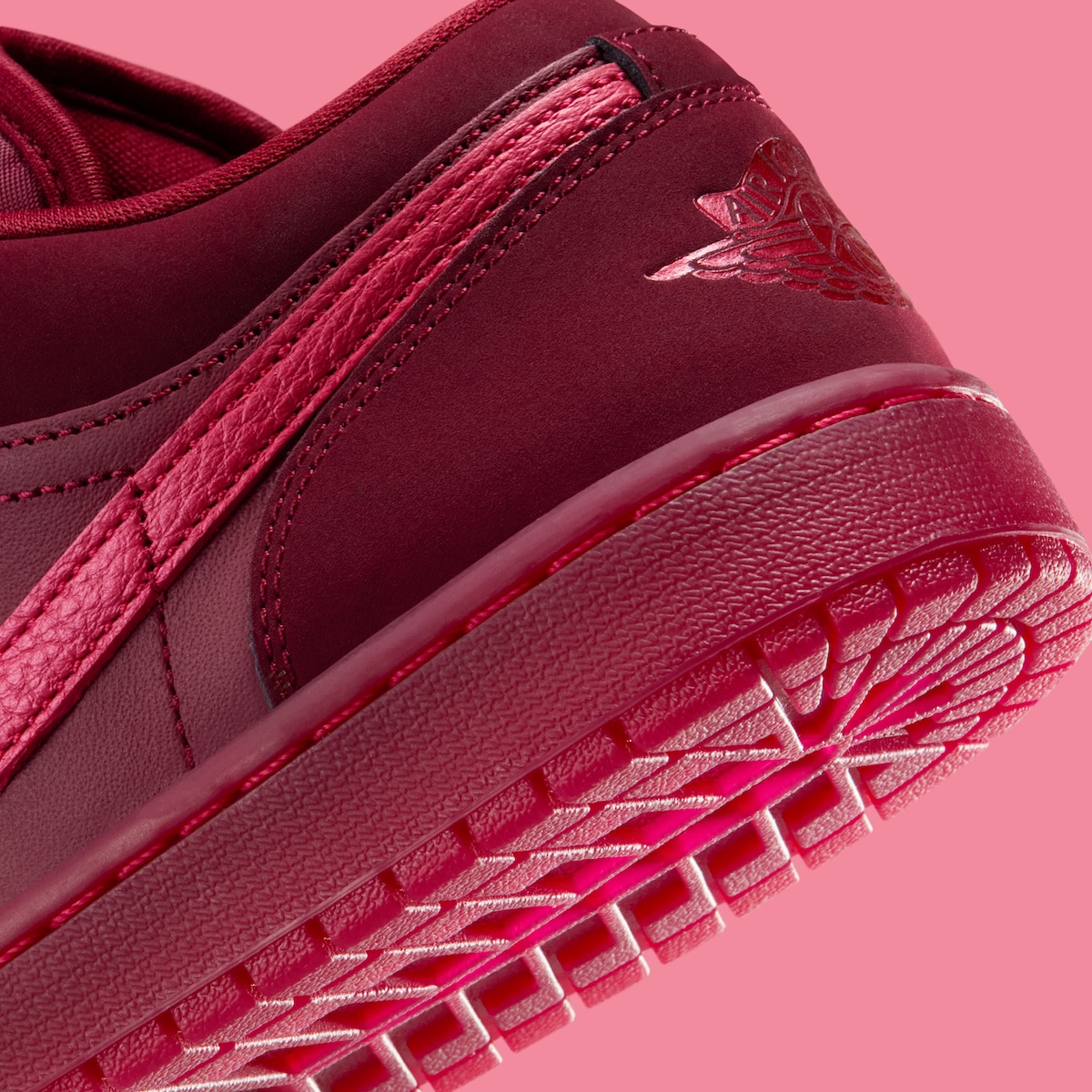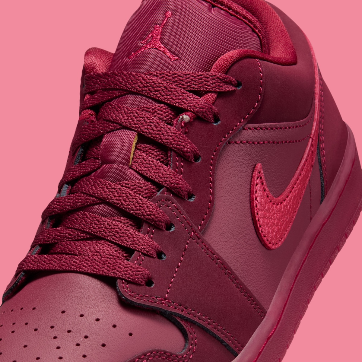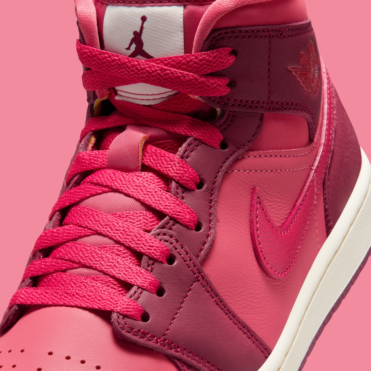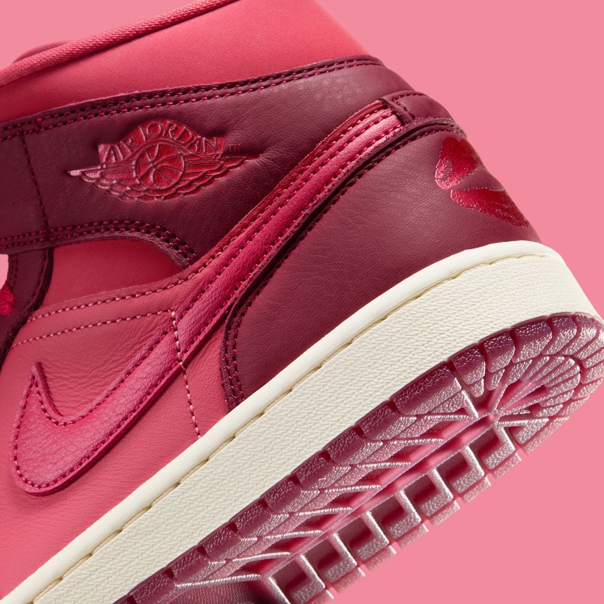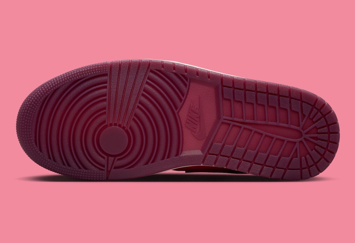 The Air Jordan 1 Mid shifts into lighter territory. Burgundy panels mix with brighter pink-red sections that change the mood completely. The white midsole and tongue tag help calm the colors. The lipstick kiss on the ankle adds character without overwhelming the design.