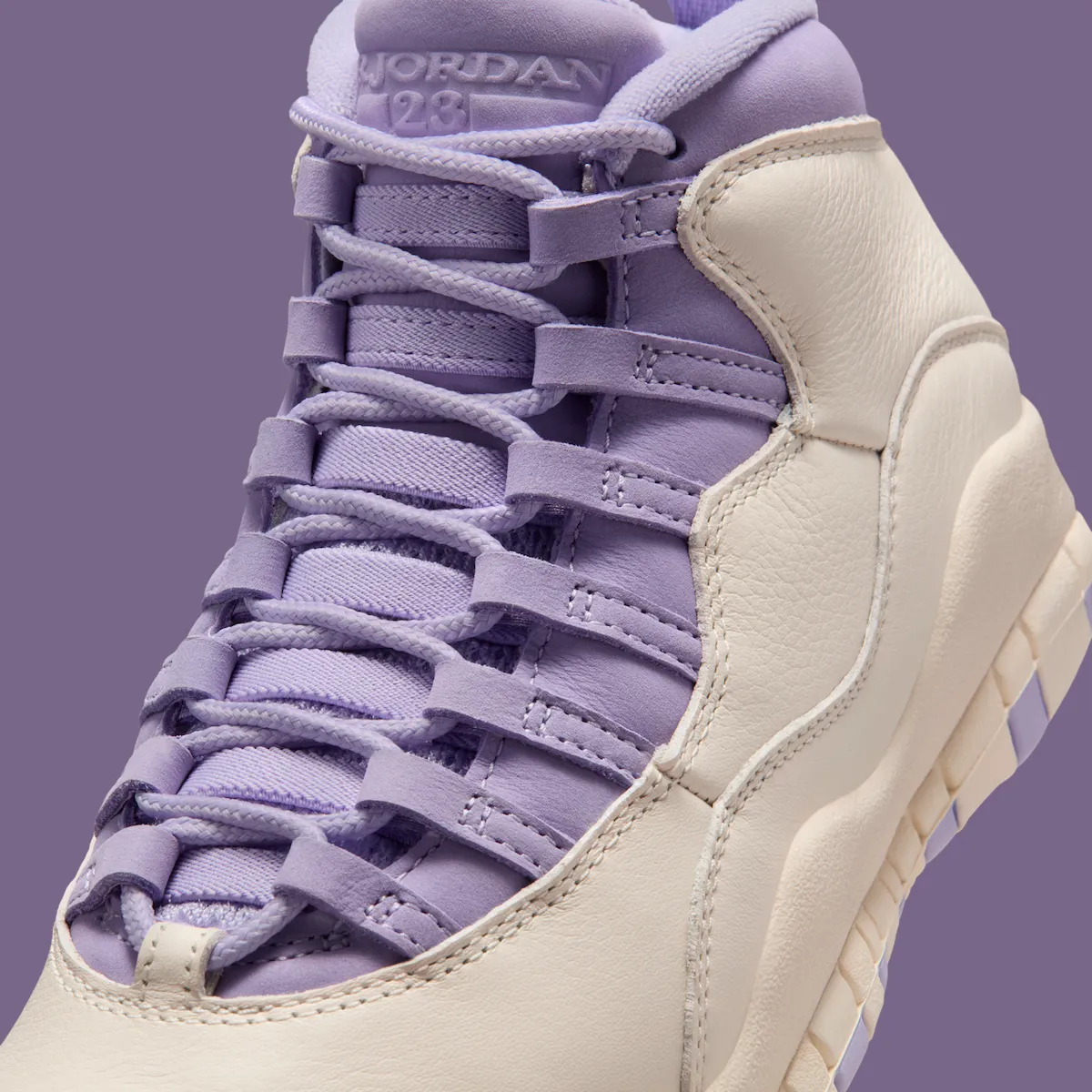 What stands out is how clean the execution feels. The Air Jordan 10 already carries strong paneling and form, and this colorway lets that architecture breathe. The purple detailing adds character without distracting from the silhouette’s natural lines.