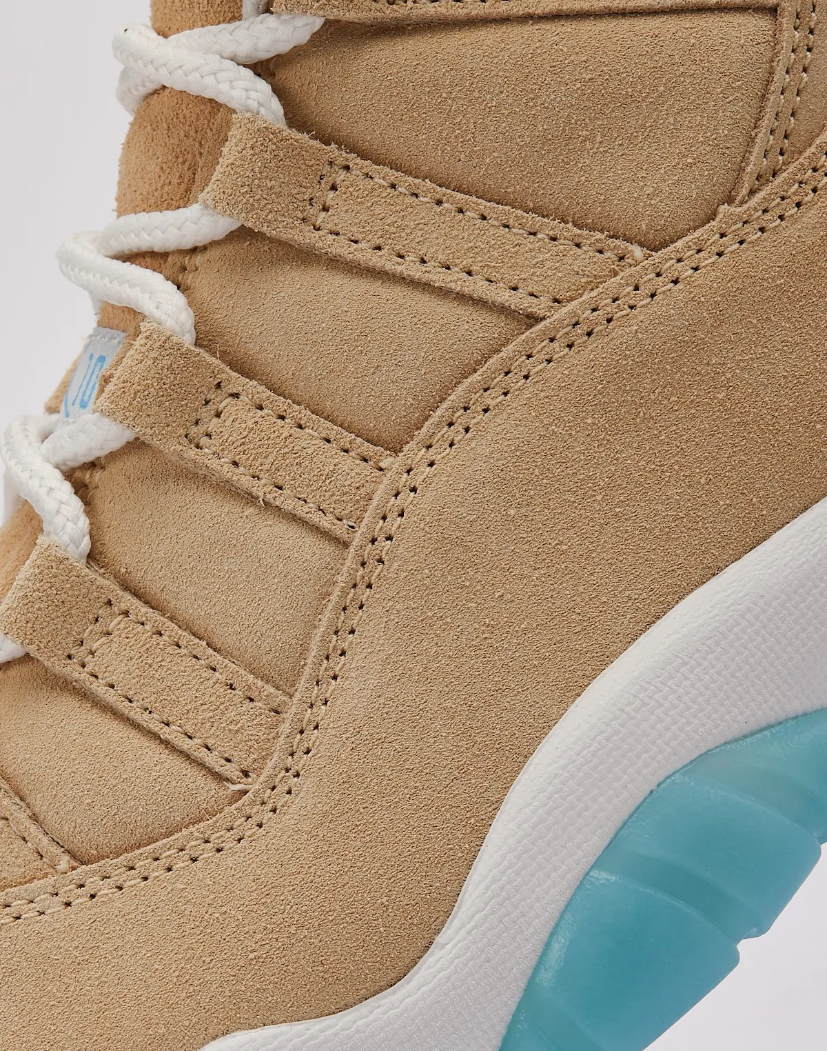 The upper is decked out in premium suede and dons a sandy “Canvas” colorway for a fresh and versatile aesthetic. The chrome Jumpman logo adorning the collar is a nod to Houston’s flashy custom cars, while the icy blue outsole provides contrast and a heritage reference to the AJ11. That detail alone makes the shoe feel like a combination of a timeless performance design and lifestyle sneaker.