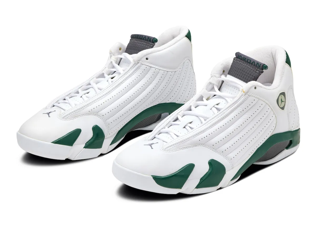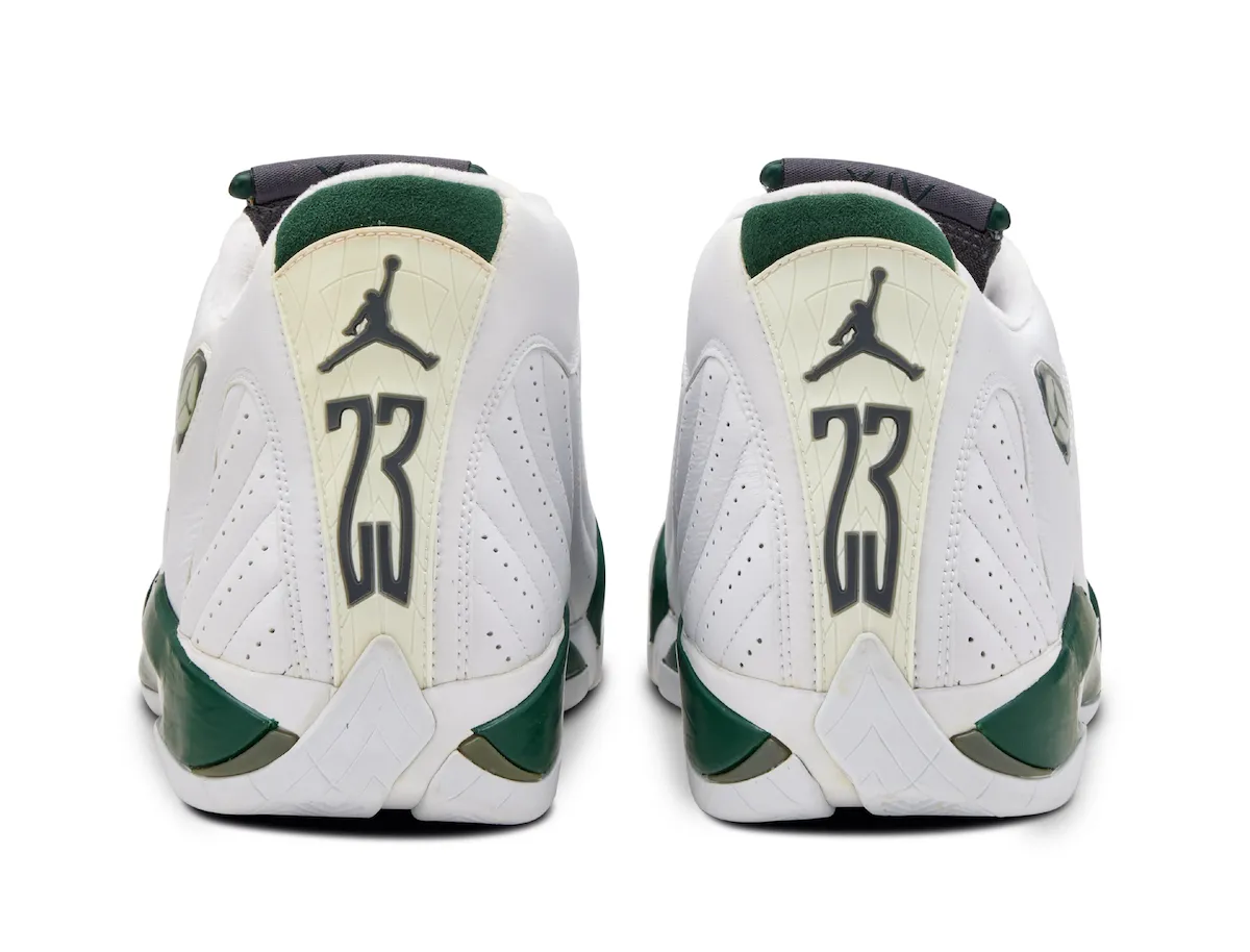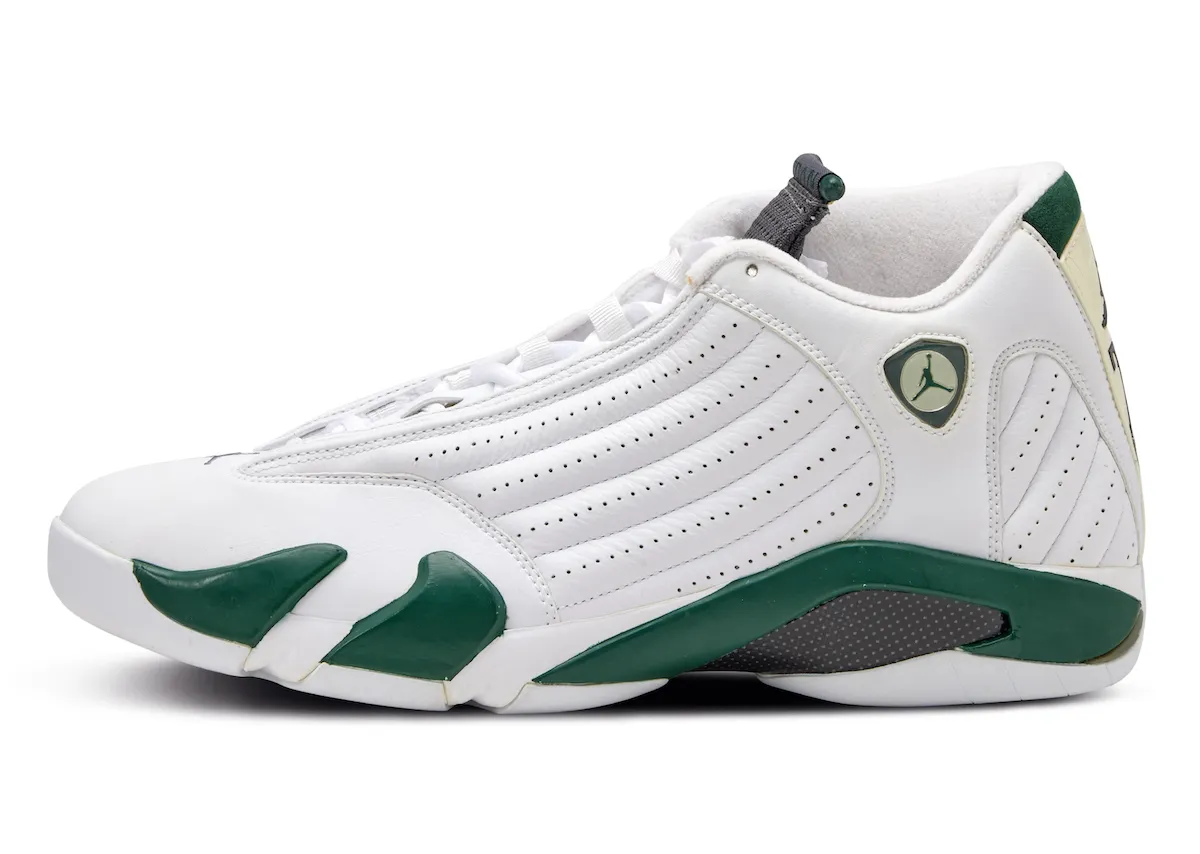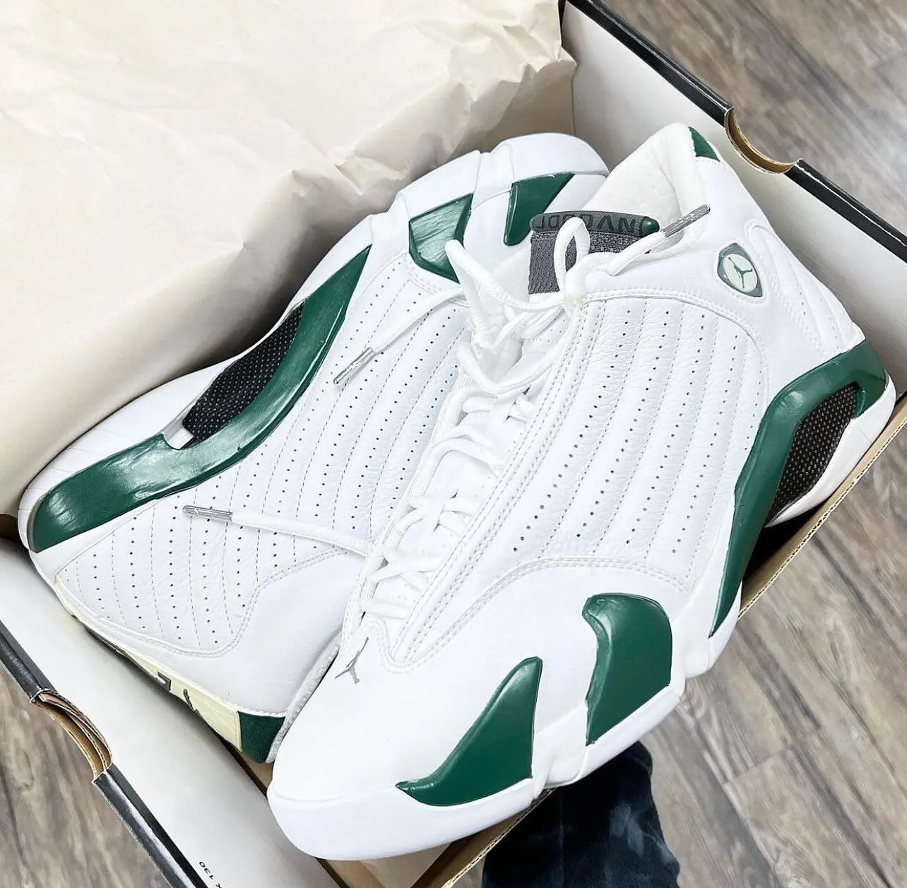 This retro stays very close to the original build. It uses smooth White leather with the Air Jordan 14 signature perforated panels, keeping the silhouette’s sleek “sports car” DNA intact. Dark Forest Green replaces the bold Red used on releases like the “Candy Cane”, offering a deeper, more understated contrast. The Green accents hit the midsole teeth, heel badge, and trim, while Black details and a carbon-fiber shank plate ground the performance aesthetic. A solid White rubber sole completes the design while adding a nostalgic touch without forcing the look.