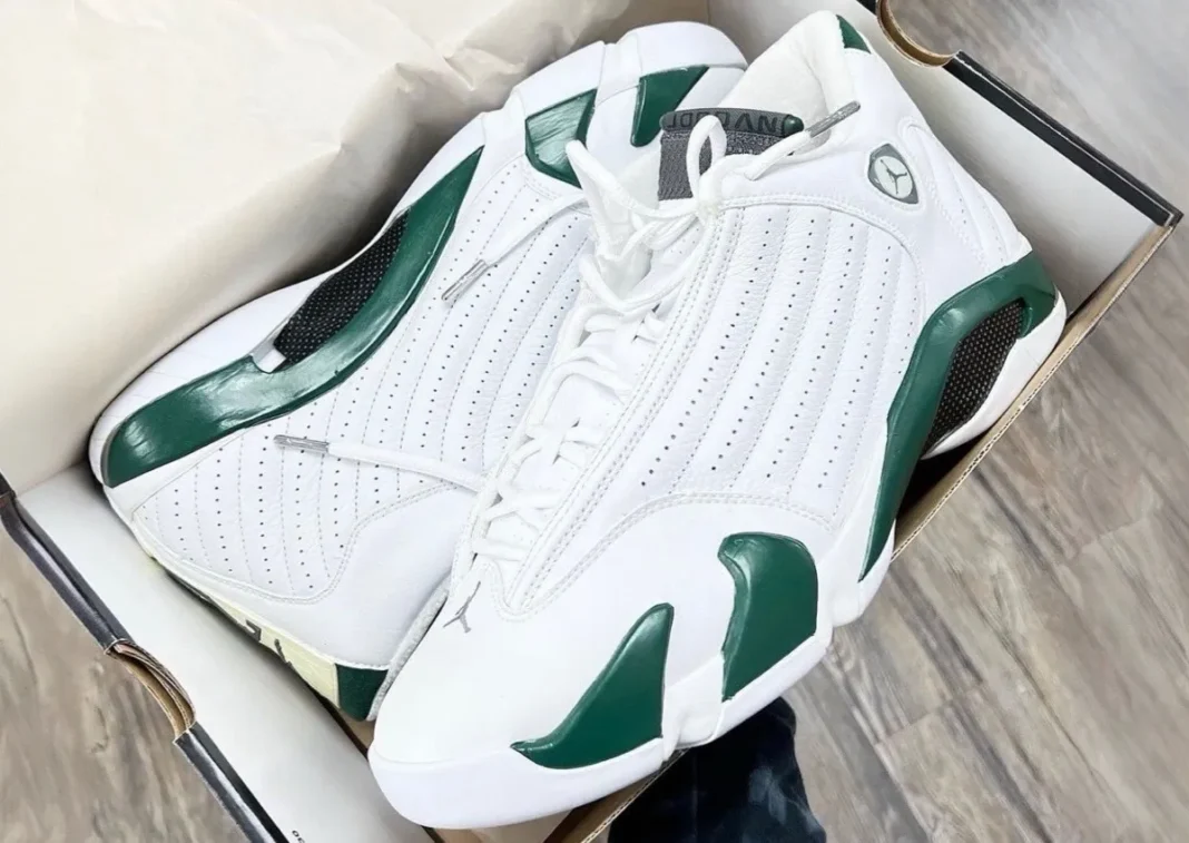 This retro stays very close to the original build. It uses smooth White leather with the Air Jordan 14 signature perforated panels, keeping the silhouette’s sleek “sports car” DNA intact. Dark Forest Green replaces the bold Red used on releases like the “Candy Cane”, offering a deeper, more understated contrast. The Green accents hit the midsole teeth, heel badge, and trim, while Black details and a carbon-fiber shank plate ground the performance aesthetic. A solid White rubber sole completes the design while adding a nostalgic touch without forcing the look.