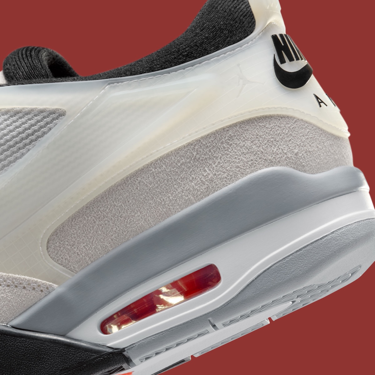 White canvas anchors the upper, while Light Smoke Grey suede adds quiet depth. A semi-translucent heel cage modernizes the shape, contrasted by black Nike Air branding. Meanwhile, the Infrared 23 Air unit offers a controlled hit of color without breaking the palette. The result feels deliberate rather than decorative.