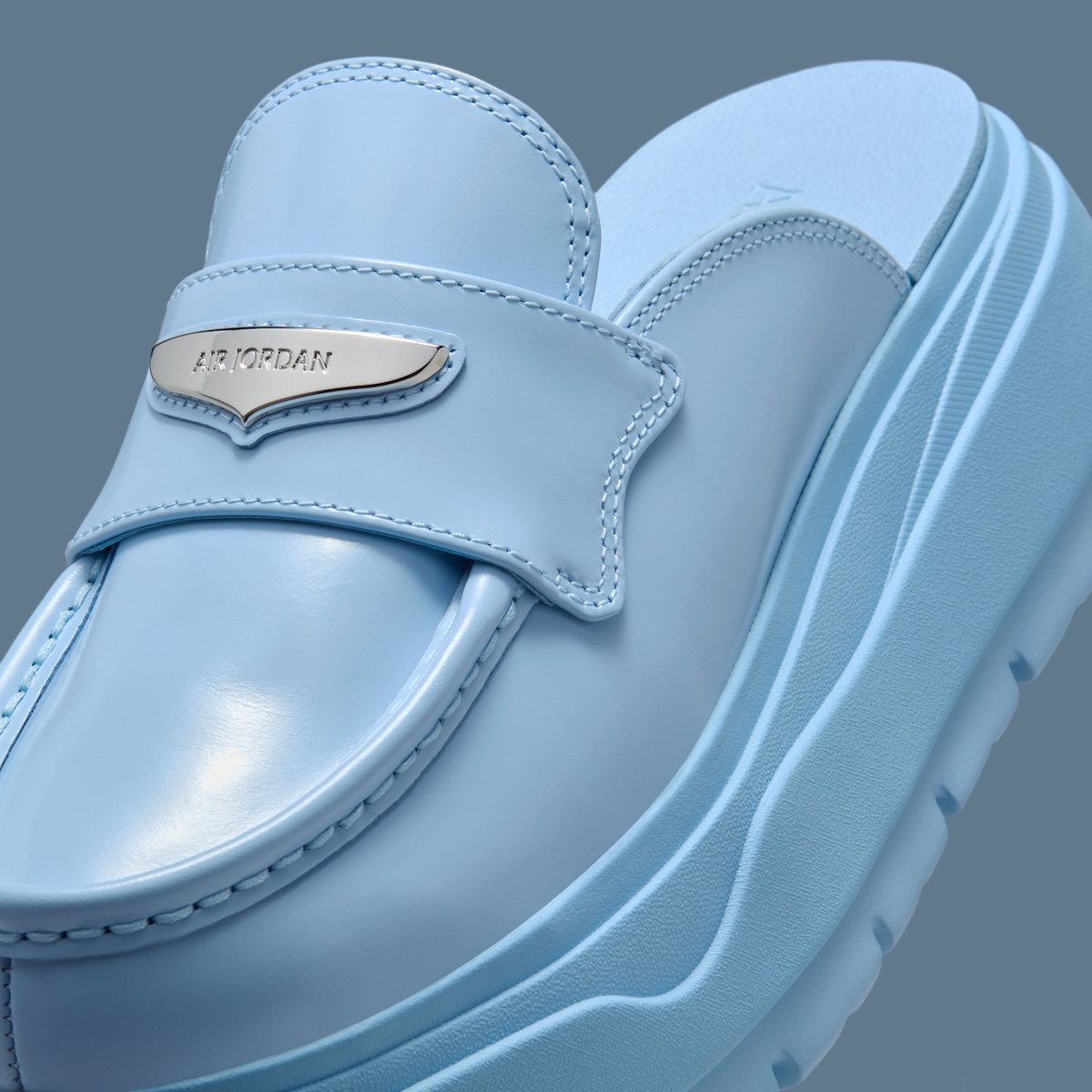 Smooth Psychic Blue leather shapes the upper, giving this Air Jordan slip-on a polished finish. A wide midfoot strap holds a Metallic Silver badge that adds just enough contrast.