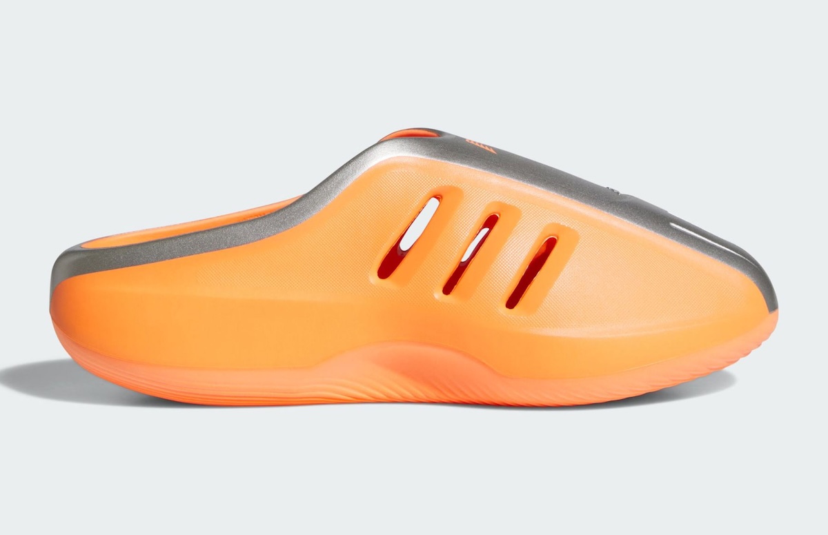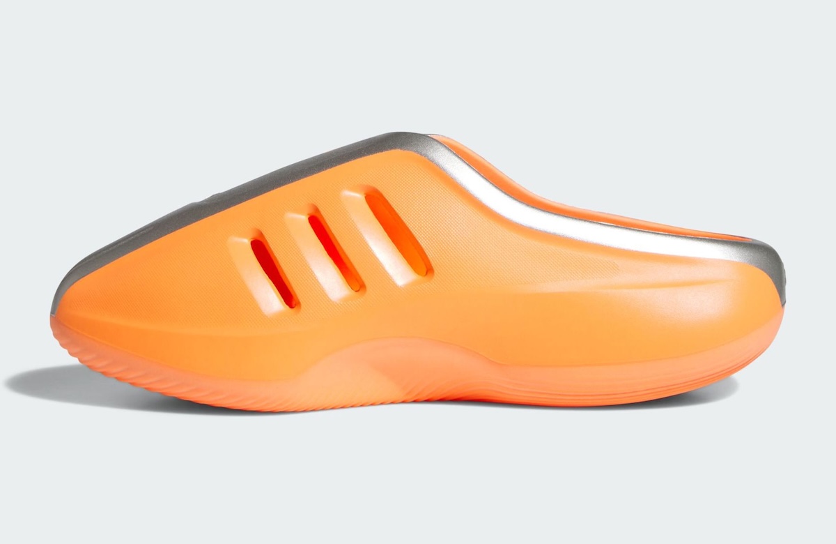 The mule keeps the sculpted, one-piece build. The Three Stripes vents remain carved into the sides for airflow. Edwards’ version leans into louder personality, with the high-visibility orange base creating a sharp contrast against the metallic panels. The footbed keeps its deep, rippled texture, which gives the silhouette that recovery-focused comfort fans call out often.