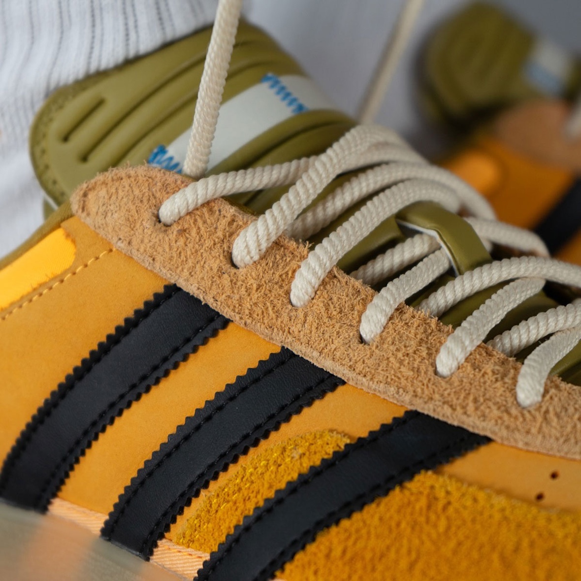 This Gazelle model features a vibrant yellow upper, accented by olive tongues and tan lace-stays, creating a striking visual appeal. A semi-translucent sole adds a modern edge to the design, while intricate details elevate the sneaker. A twisted T-toe design, jagged contrast stitching, and cerulean accents on the tongue and aglets reflect Bad Bunny’s eclectic style. These features give the classic Gazelle silhouette a bold, contemporary twist that blends adidas’ heritage with modern flair.