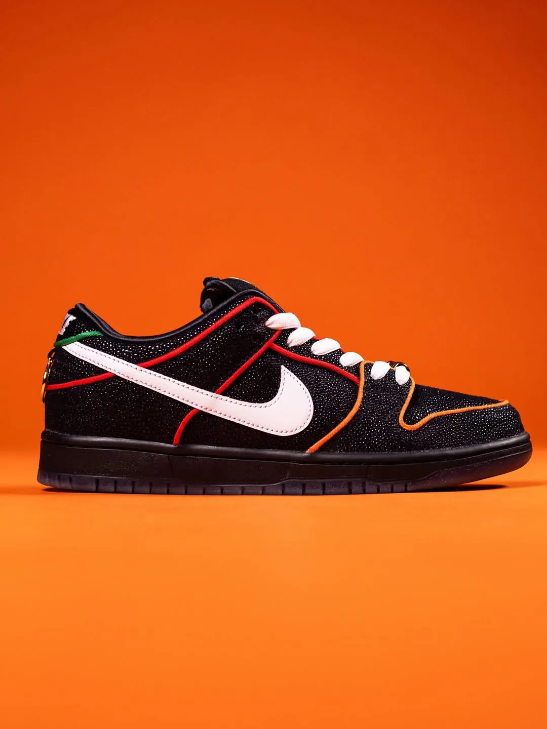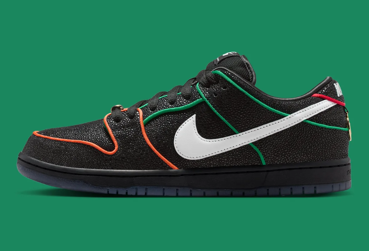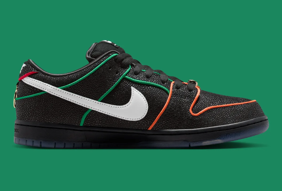 The SB Dunk Low features a bold color palette of Black, White, Challenge Red, Total Orange, Lucky Green, and Smoke Grey. Its upper now fully revealed, includes stingray-textured leather with colorful piping and a clean white Swoosh to balance the vibrant tones.