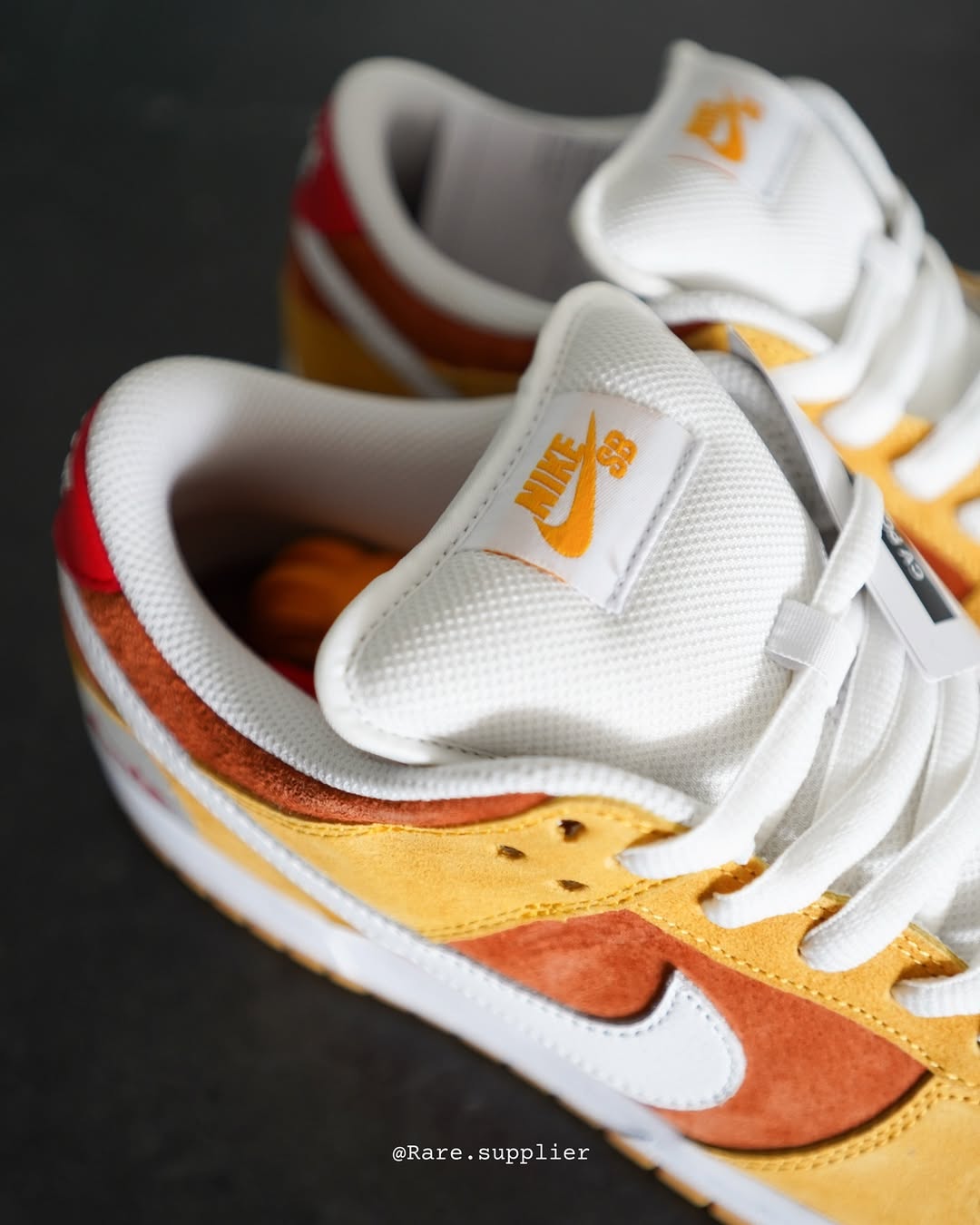 The Nike SB Chocolate Sun Dunks showcase a nostalgic design with bold details. The yellow suede upper is accented with brown overlays, a white Swoosh, and a vibrant red heel tab. A gum outsole provides both style and grip, perfect for skateboarding. Each pair comes in a standard Nike SB box within the custom packaging, elevating the collector’s experience.
