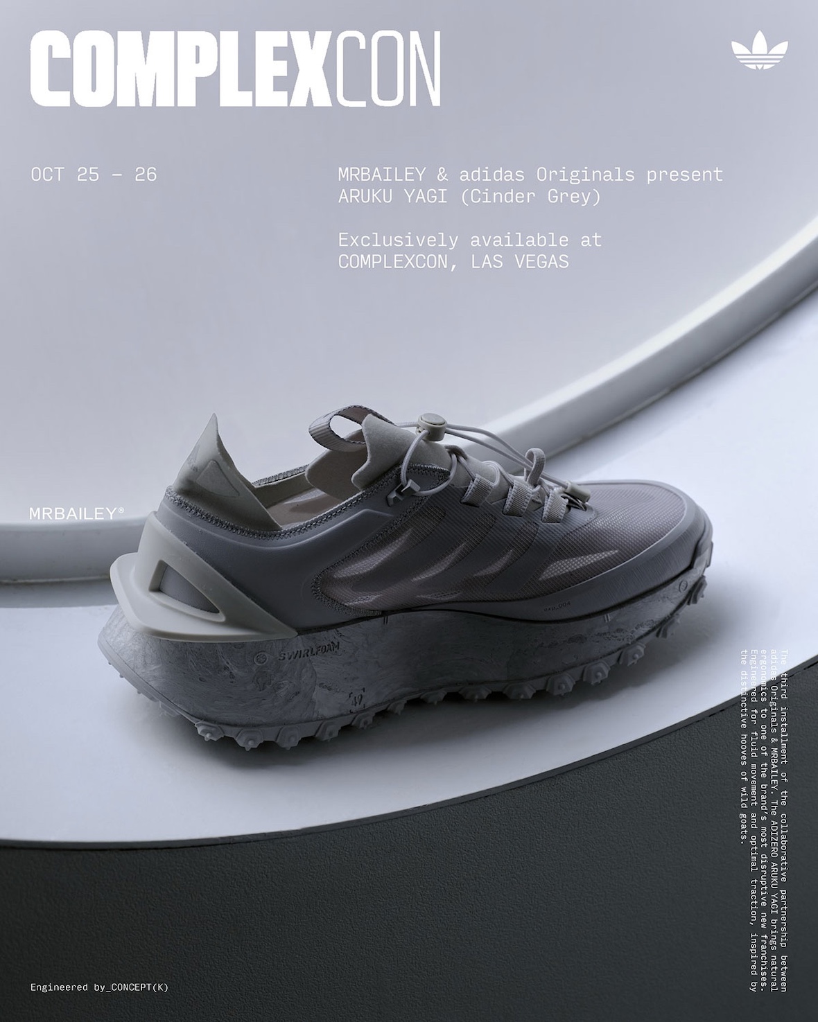 Footwear designer Mr Bailey continues to redefine form and function with his sculptural Aruku Yagi silhouette. The “Cinder” colorway — a minimalist grey take — will be a ComplexCon-exclusive, ahead of a wider launch of the black pair in November.