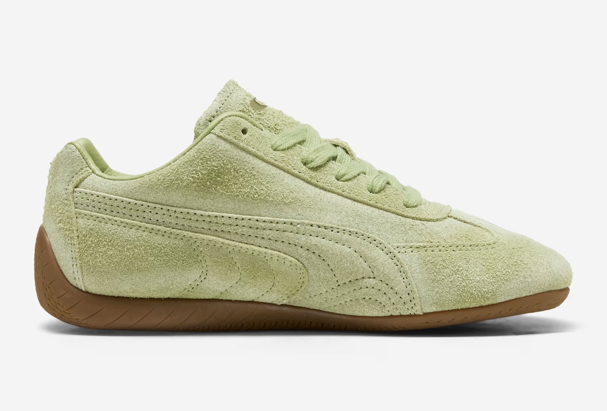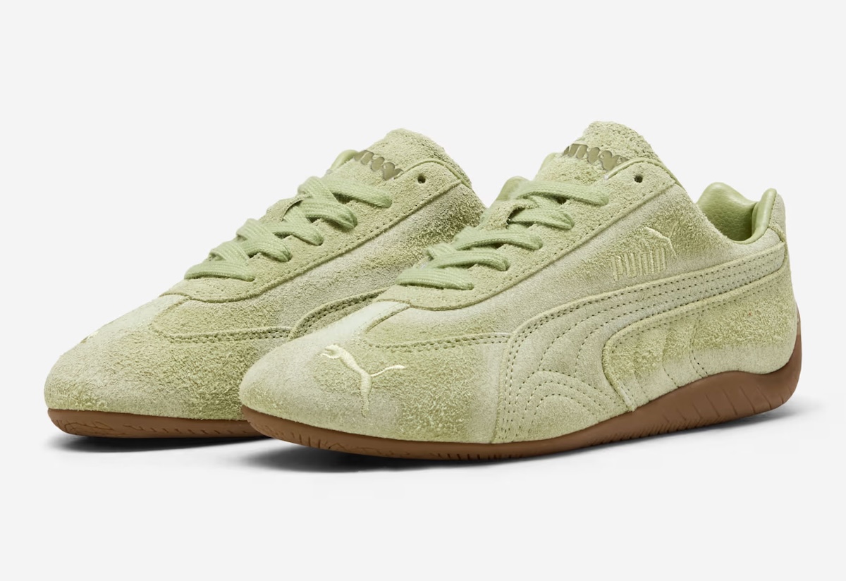 The Danielle Cathari x Puma Speedcat OG Suede sits on the cleaner side of that equation. A soft matcha-green upper uses short, brushed suede that looks gently broken in, as if time—not polish—shaped it. The slimmer, racing-derived Speedcat profile keeps things low and streamlined, while a warm gum sole grounds the look with classic Puma DNA. Cathari’s dot signature appears discreetly on the heel, and the tongue carries understated spell-out branding rather than loud graphics.