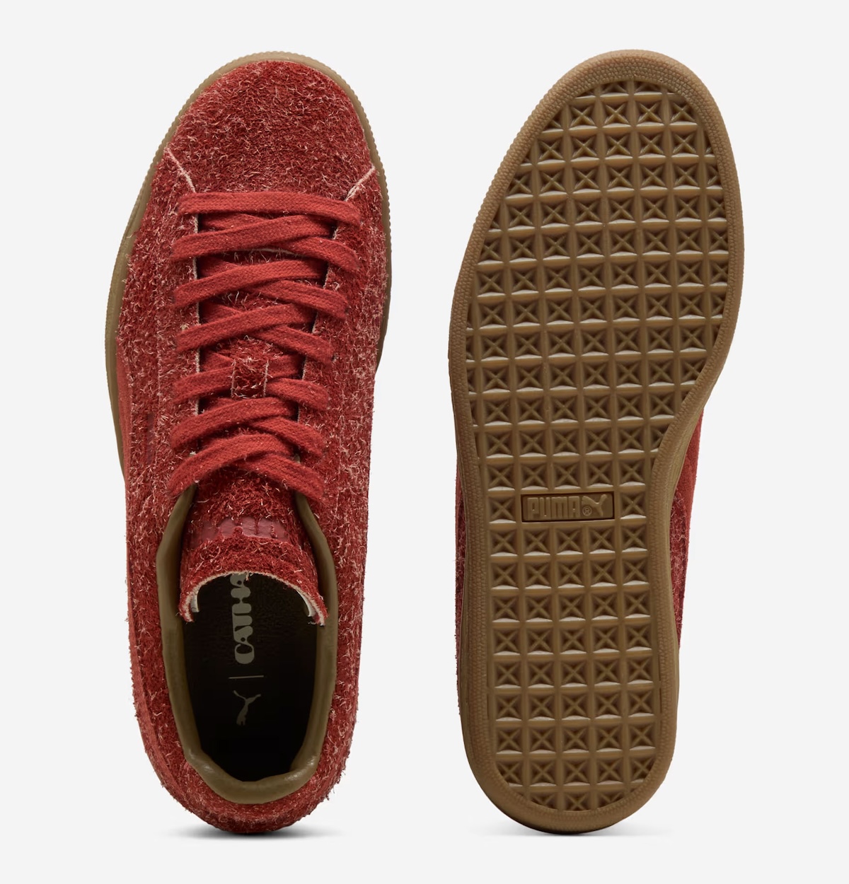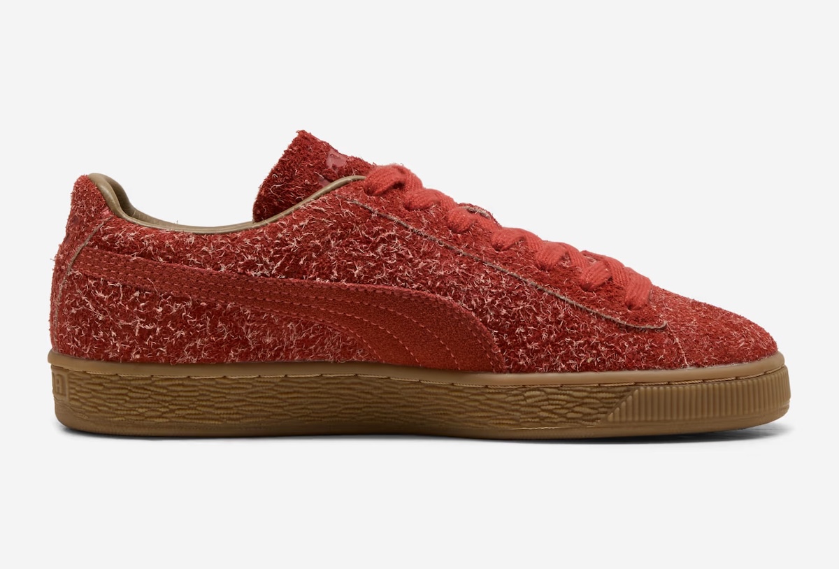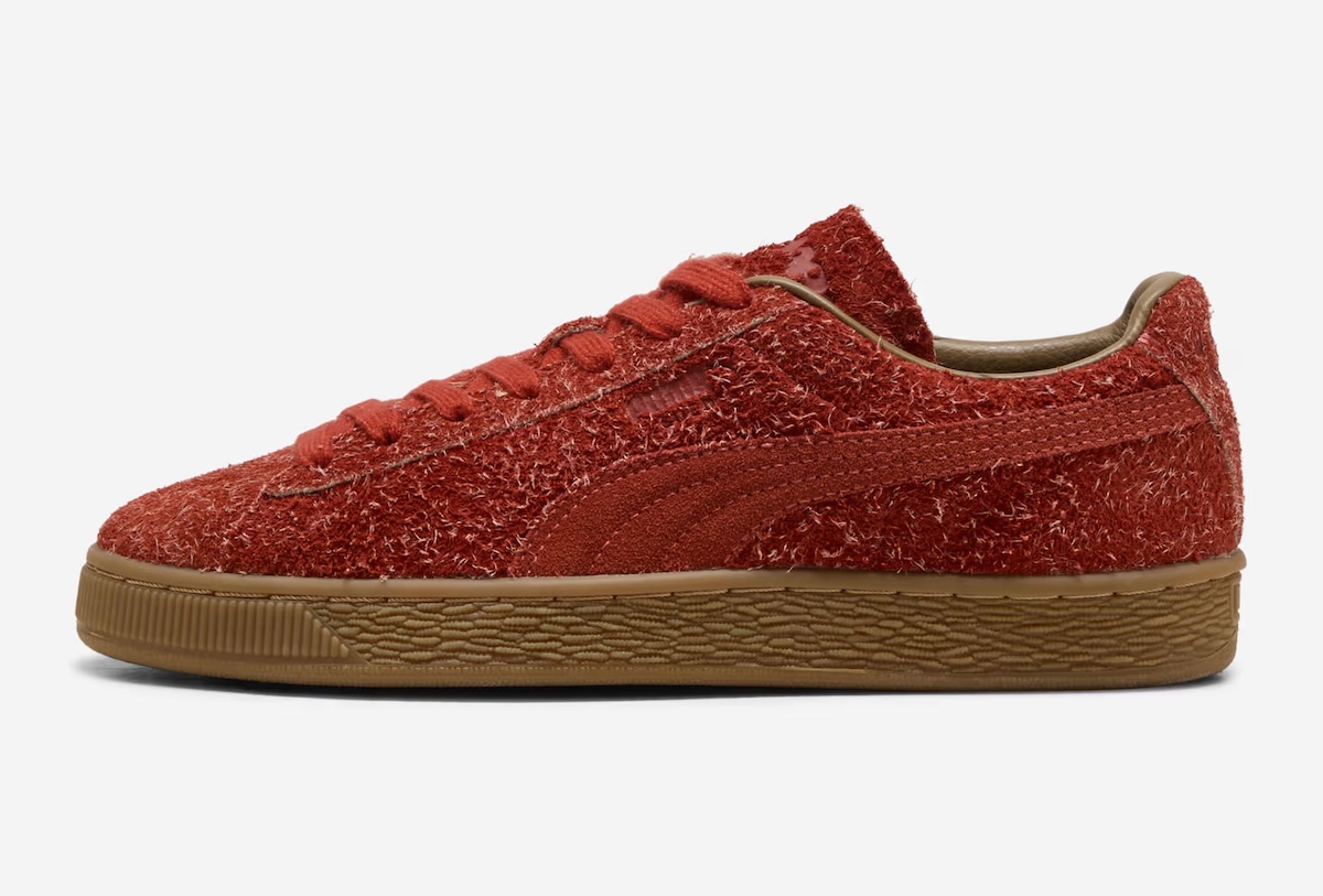 Alongside it, a dark red PUMA Suede pulls in the opposite direction. Its long, shaggy suede feels tactile and uneven, with lighter fibers breaking through the deep red-orange base. The traditional Suede shape reads bulkier at the toe, but the same textured gum sidewall ties both pairs together.