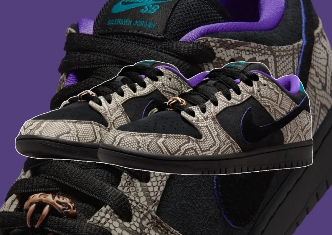 That vision now arrives in full form. The SB Dunk Low features textured snake-inspired overlays paired with black suede panels for balance. Inside, a rich purple lining adds contrast, while teal hits appear on the heel tabs and tongue branding, alongside Jordan’s name. The design stays grounded with a blacked-out sole, allowing the details to stand out without feeling overdone. A standout touch comes in the form of a small copperhead graphic wrapped around the laces, tying directly into the theme. Newly surfaced official images also provide a closer look at the snake-textured overlays and the copperhead lace detail that anchors the Arizona-inspired design.