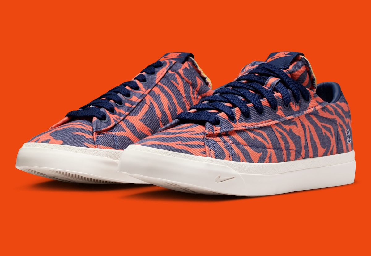 The lead pair features blue and orange tiger striping, paired with “Book” heel branding and the Tigers’ Old English logo. Meanwhile, a Pearl Grey option nods to Detroit’s road uniforms, grounding the pack with restraint.