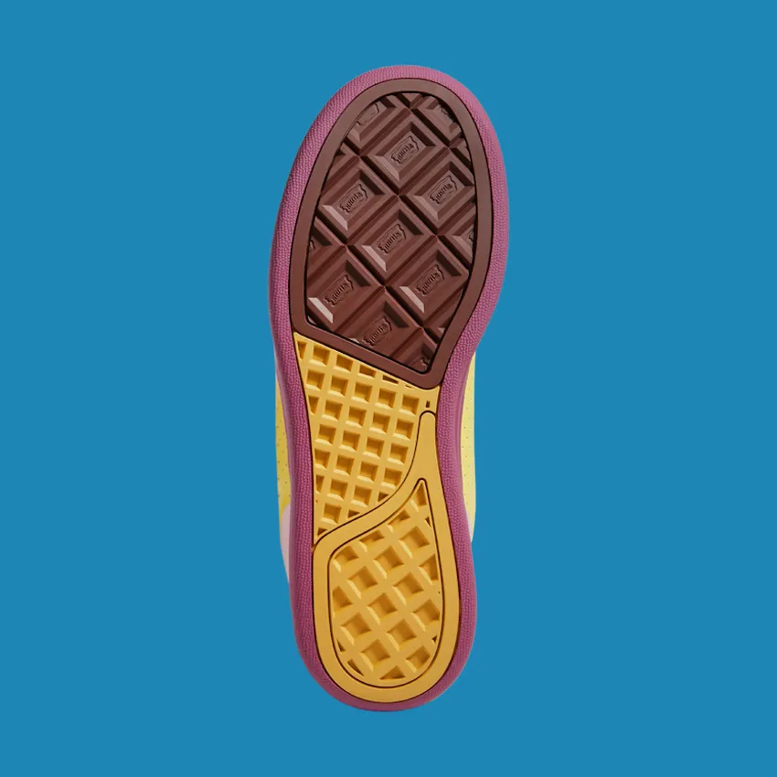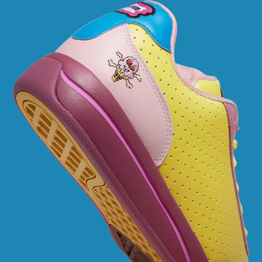 Donning banana-yellow perforated leather, strawberry-pink heels and raspberry suede overlays, a blue heel tab does just enough to offset the pastel colourway. It’s bright, nostalgic and way more wearable than you’d expect, if you’re into bold pairings. The embroidered melting ice cream cone graphic on the heel ties it all back to early ICECREAM iconography sneakerheads still recognize.