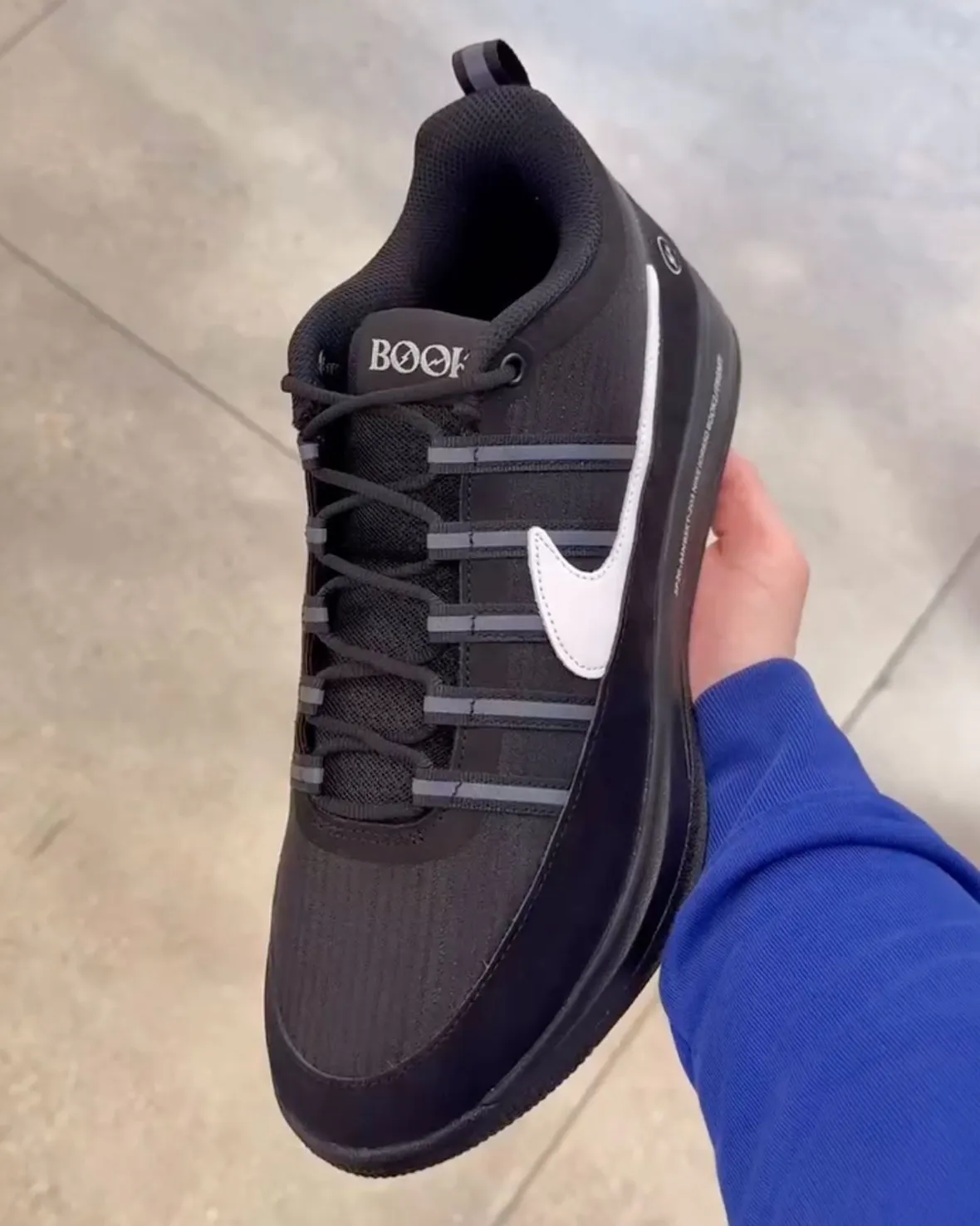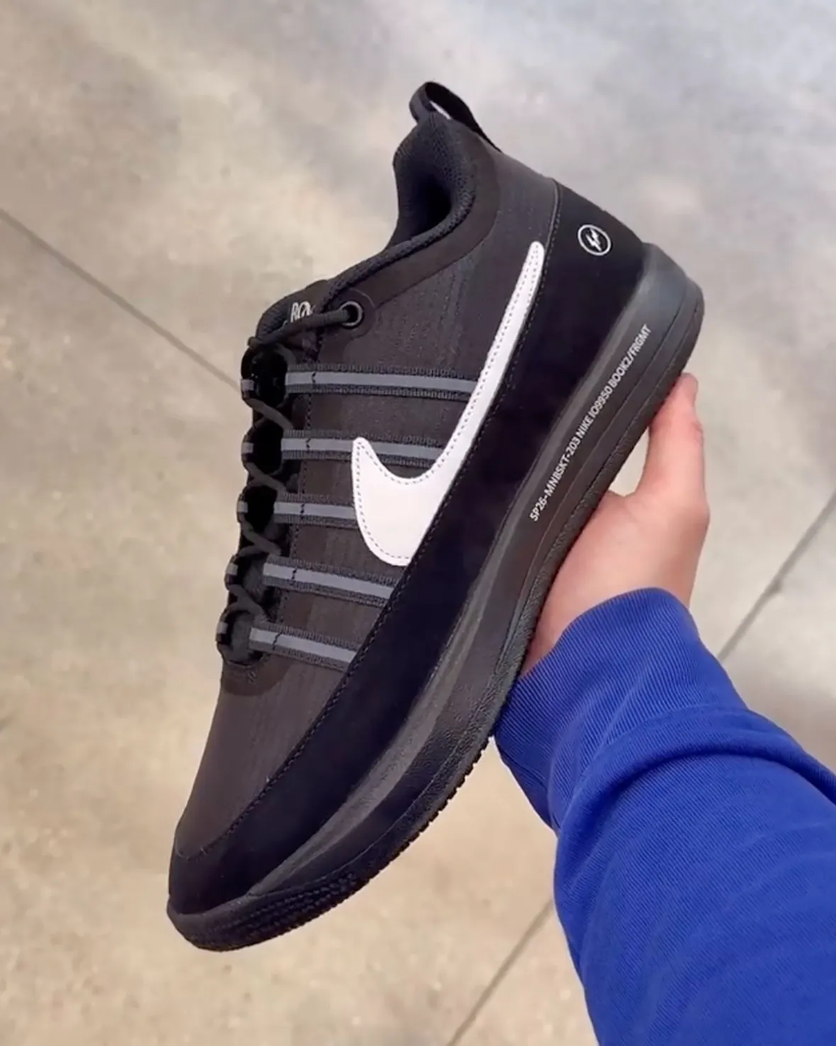 What stands out immediately is the simplicity of the upper. A sleek nylon base replaces layered textures, giving the silhouette a smooth and modern finish. Mismatched Swooshes in white and blue create just enough contrast, while Fragment’s lightning “BOOK” logo on the tongue anchors the identity.