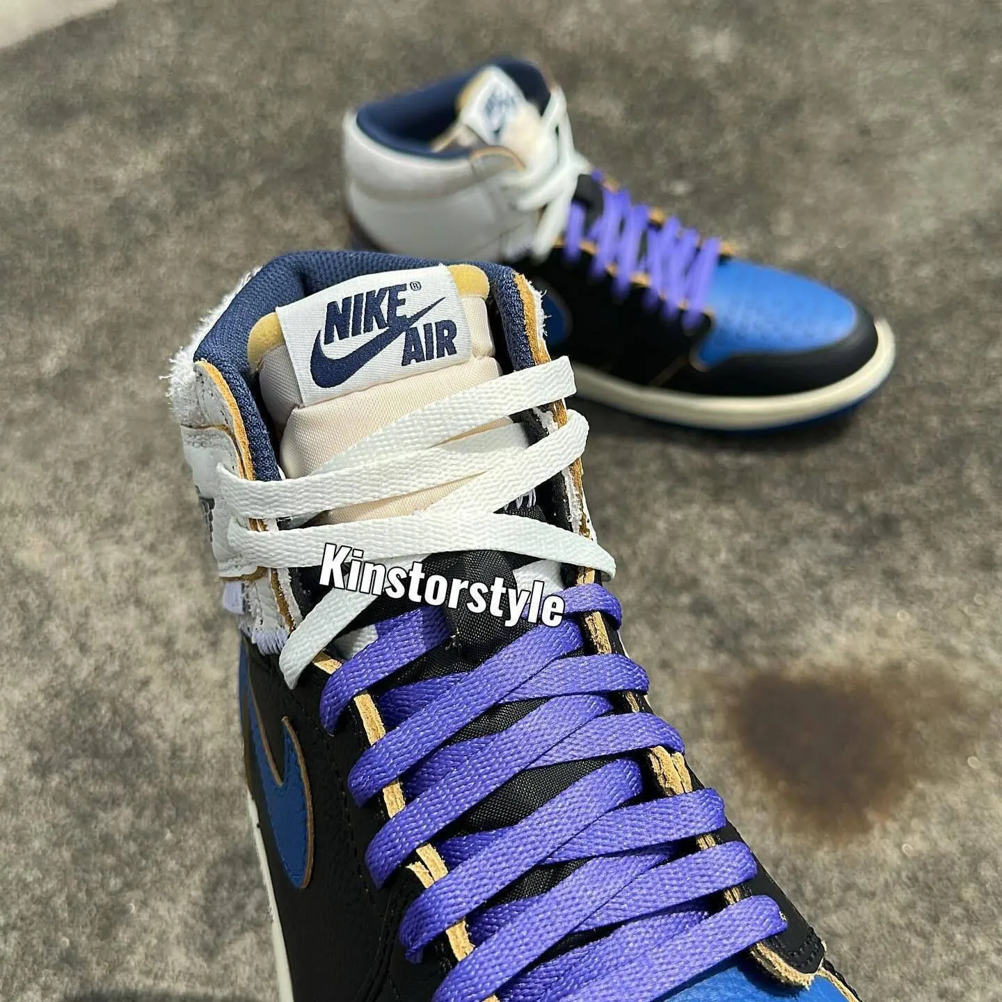 The Air Jordan 1 features a mix of Black, Navy, Sport Royal, and Sail colors. Premium leather and classic paneling give the shoe a vintage yet modern feel. Signature Union elements like exposed foam tongues and visible stitching add to its retro appeal.