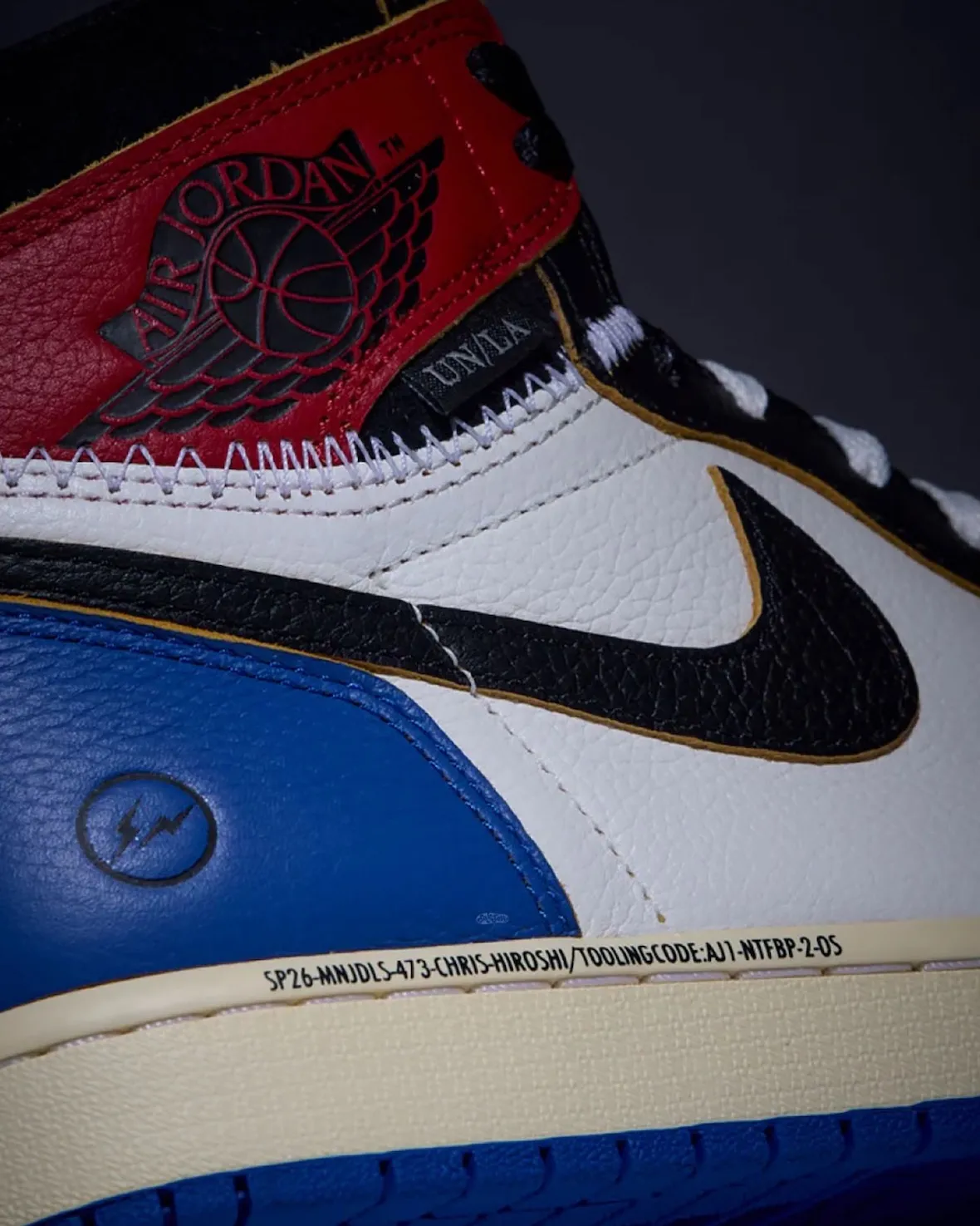 At the center of the pack is the most accessible colorway, dressed in Black, White, Varsity Red, and Sport Royal. It layers Union’s signature stitched construction over Fragment’s legendary 2014 Air Jordan 1 design language. The mix feels deliberate, balancing nostalgia with a refreshed structure. Royal blue accents bring Fragment’s identity forward, while the black and red collar adds contrast without overpowering the design.