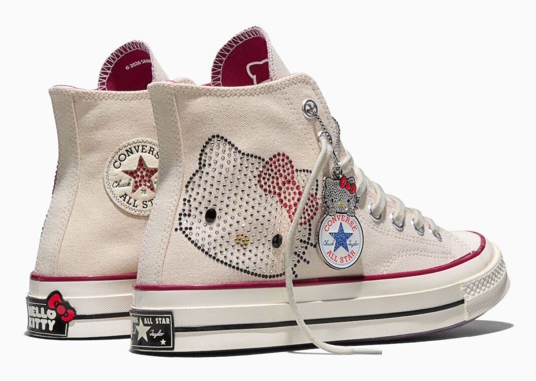 A familiar icon is back in the mix, but it doesn’t feel like a straight throwback. There’s a slightly cleaner, more dressed-up vibe this time around. The Hello Kitty x Converse Chuck Taylor 70 “Swarovski” is part of a bigger capsule, with pairs arriving March 5th in both adult and kids sizing.
