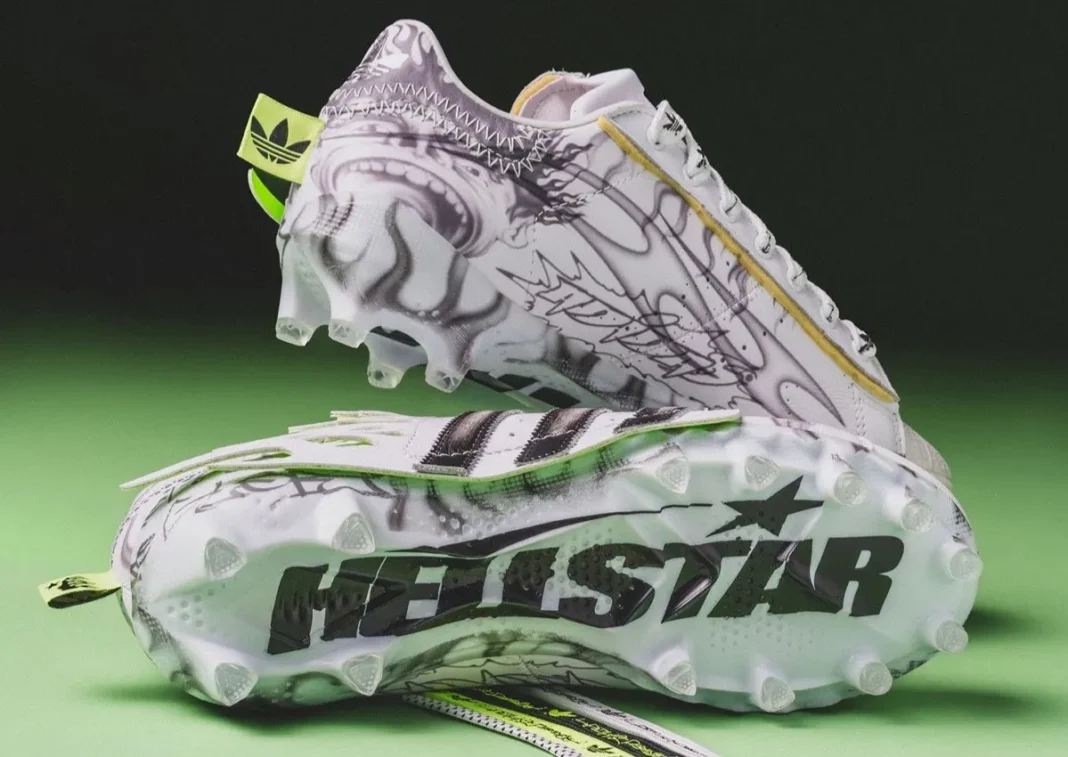 A Los Angeles brand built on graphic intensity has quietly stepped onto the gridiron. As Super Bowl week accelerates, new imagery shows Hellstar’s signature aesthetic migrating from lifestyle footwear onto a spiked version of adidas’ most famous shell-toe. The timing feels pointed, even if the pair’s role in the game remains uncertain.