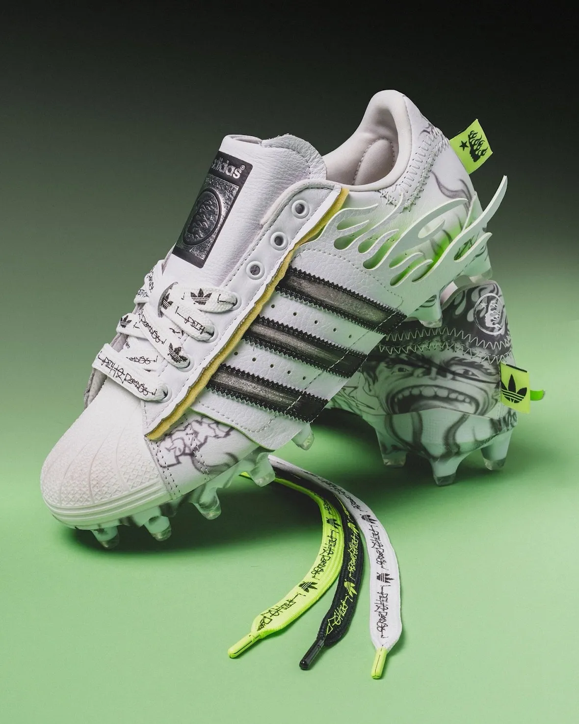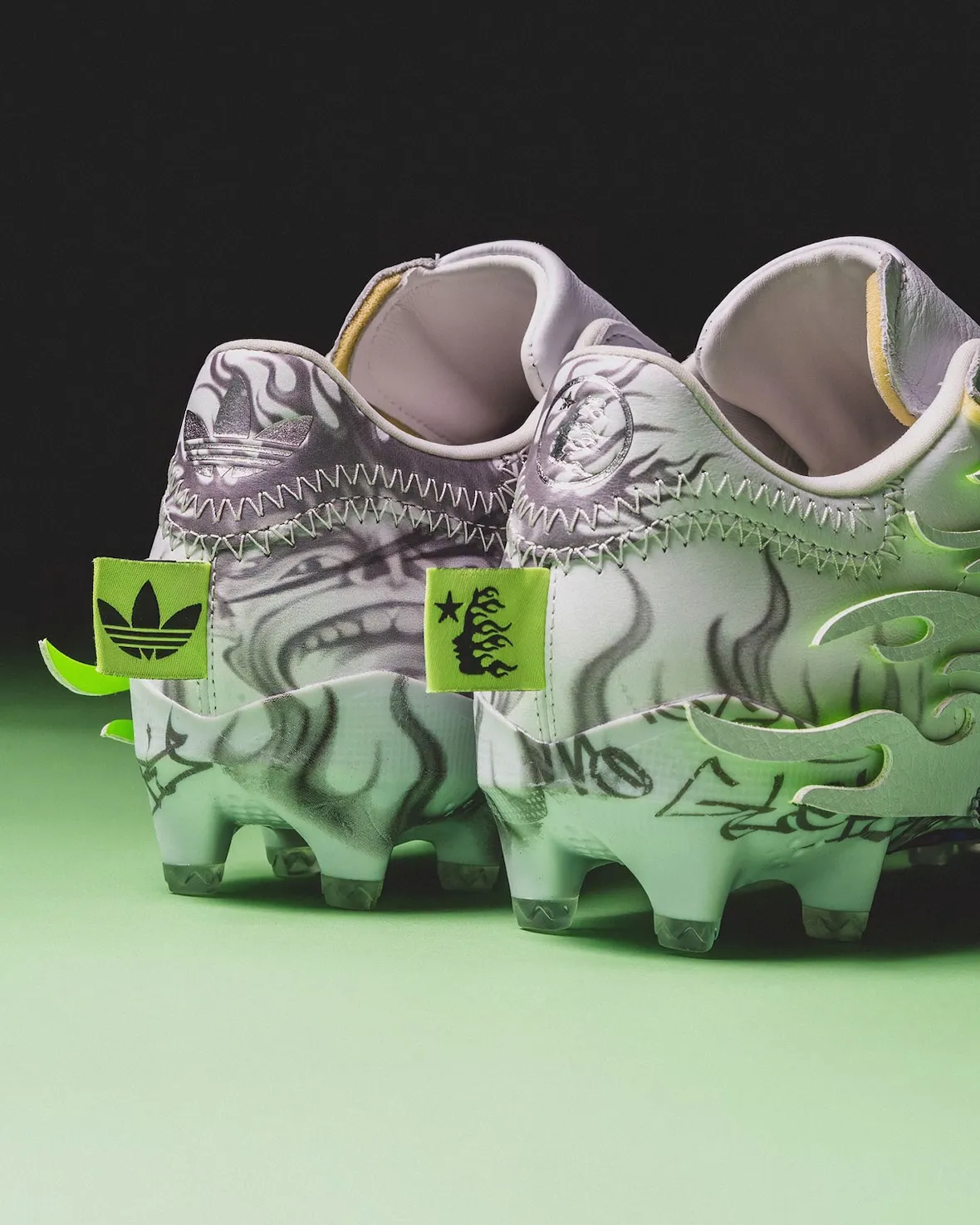 Built on a performance football chassis, the Hellstar x adidas Superstar football cleats retain the collaboration’s visual DNA rather than stripping it back. White leather, visible stitching, and layered textures keep the upper clean, while the brand’s flame motifs creep along the sidewalls with a slightly distorted edge. Neon heel tabs, custom tongue badges, and multiple lace options give the silhouette a charged, almost show-ready presence.