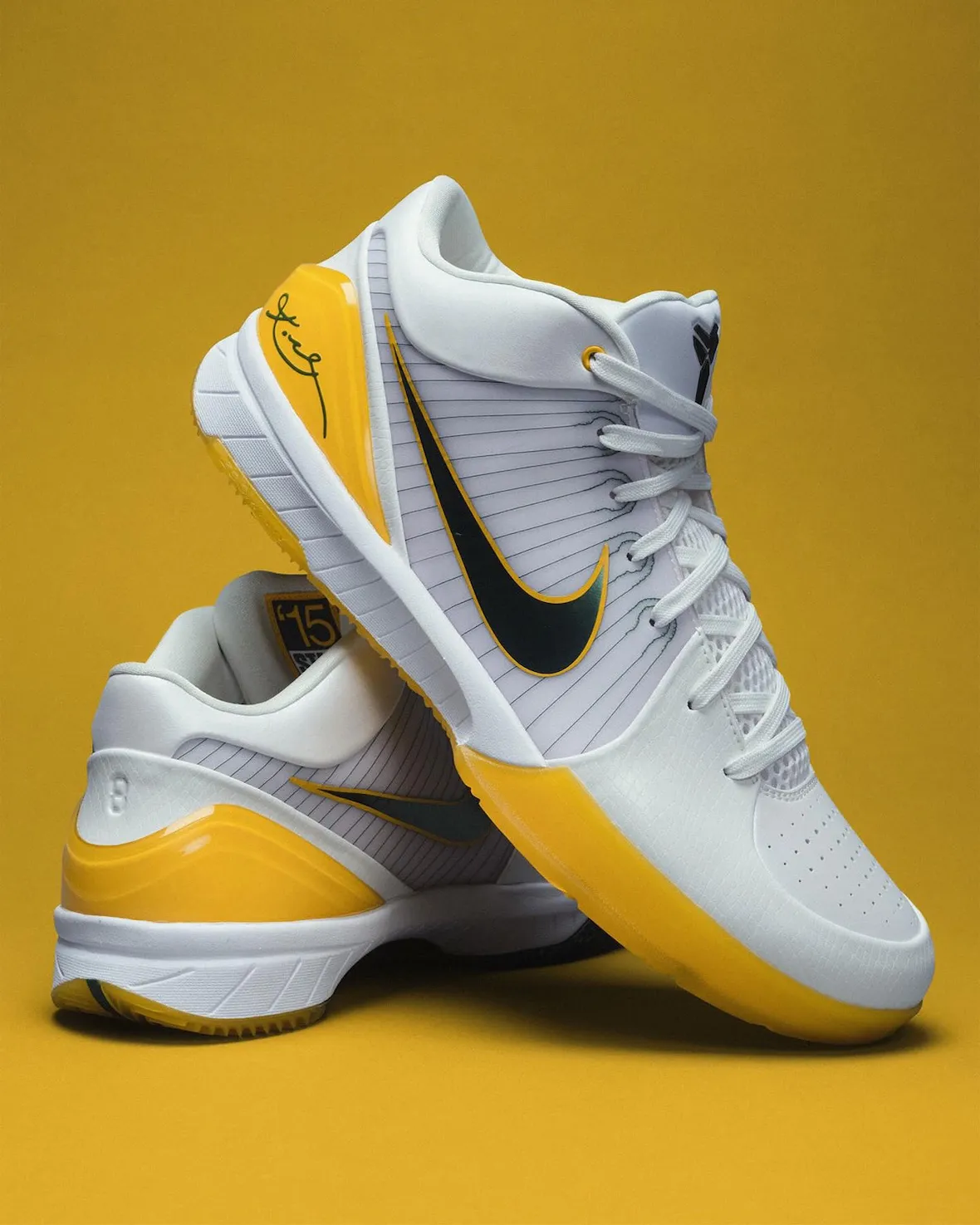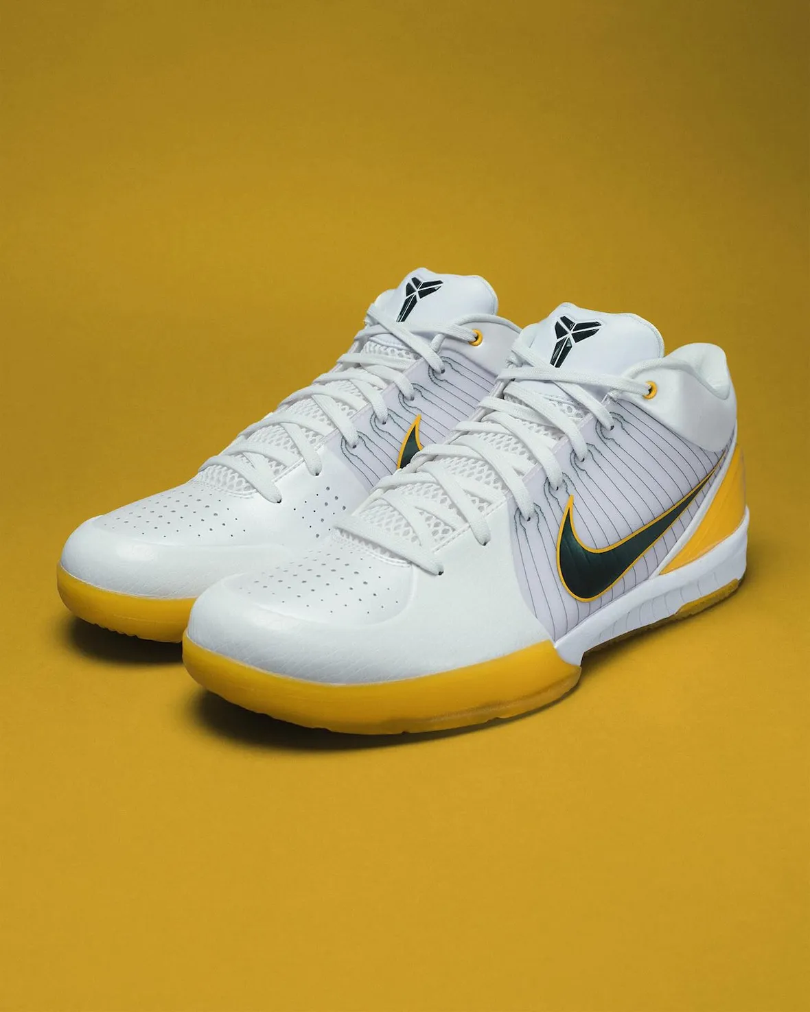 That defining moment now fuels the story behind his newest Kobe 4 Protro PE. The design reflects his high school colors, featuring a clean white base paired with bold green accents and subtle yellow detailing. Elements like the Swoosh, Flywire cables, and tongue branding lean into that green tone, while the heel and outsole introduce contrasting yellow hits. A special championship banner detail hidden behind the tongue ties the concept back to that 2015 title run.