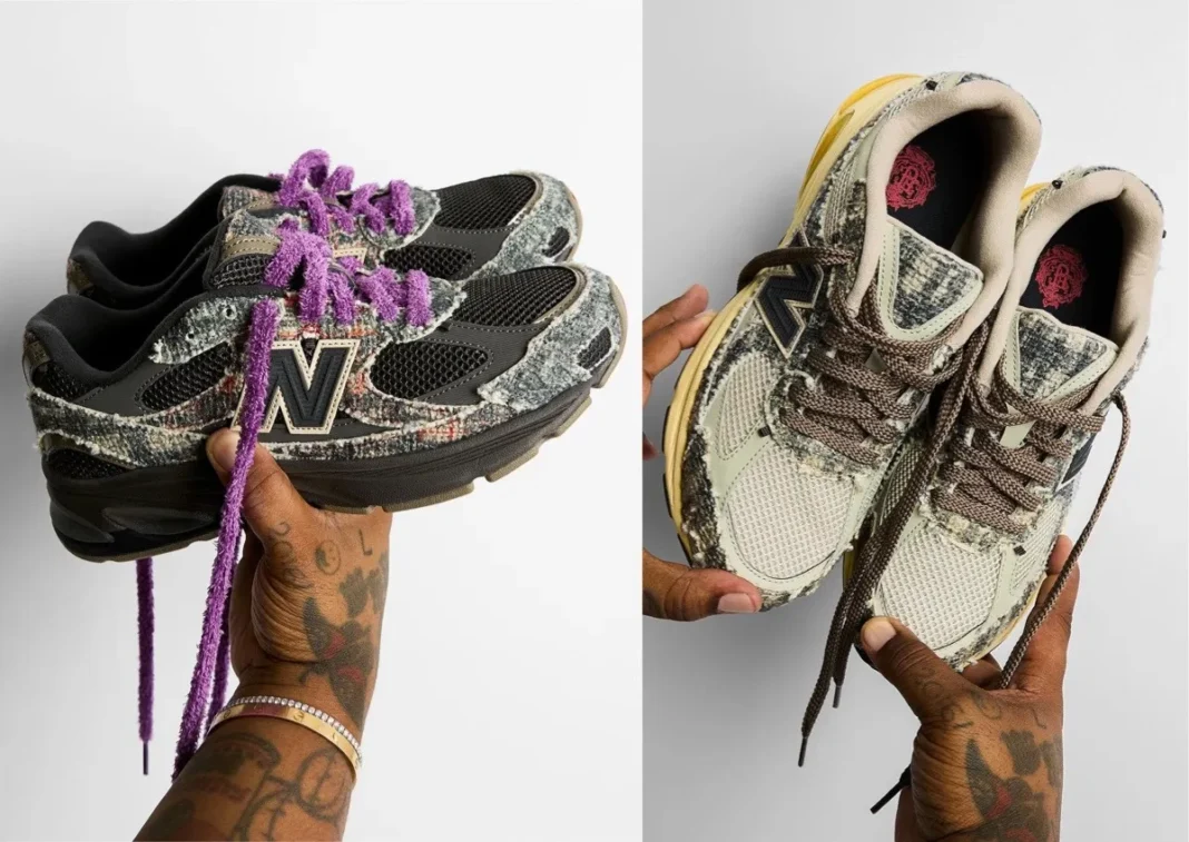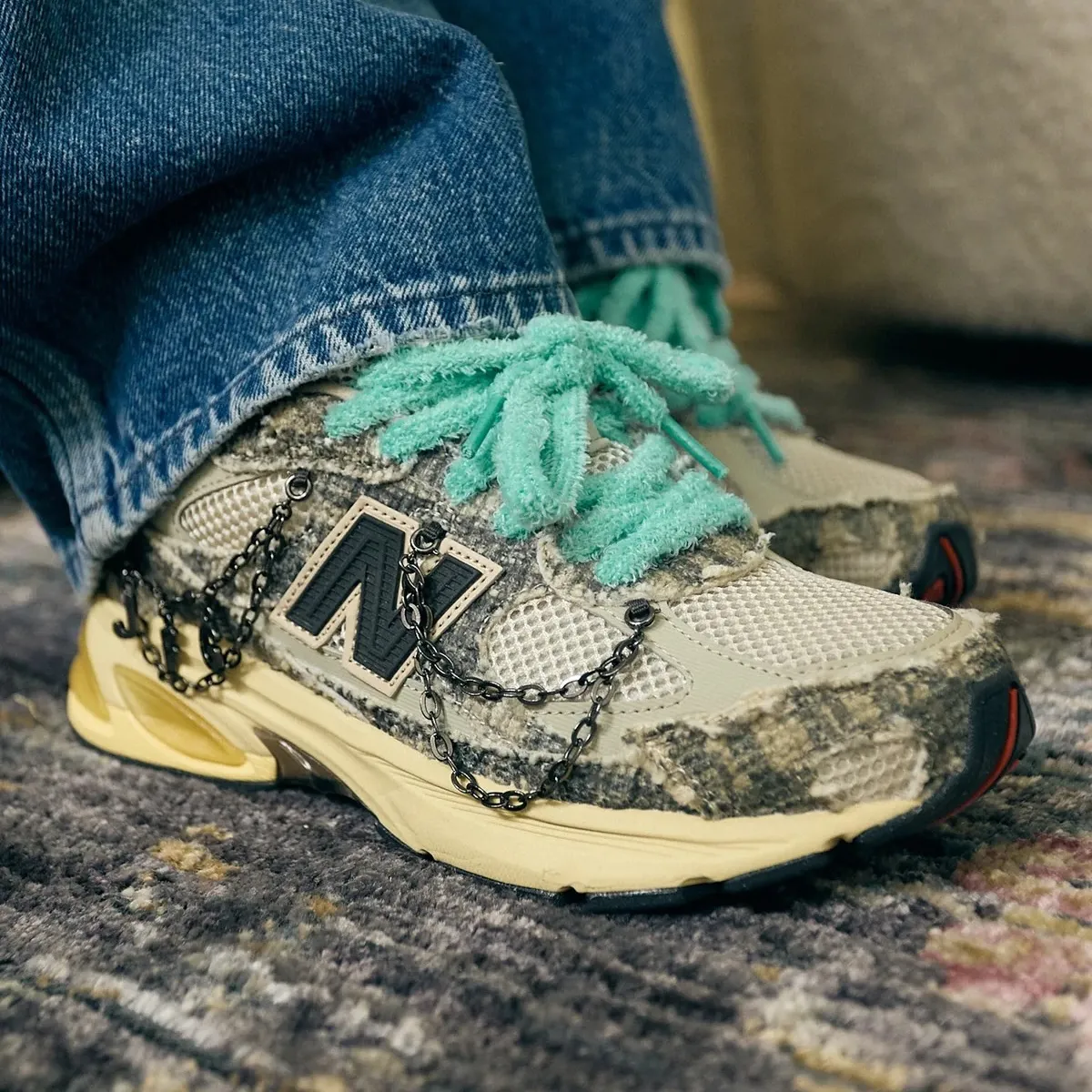 A rugged wool-like upper, cream mesh sockliner and vintage yellowed ABZORB midsole come together for a stylized distressed look. The black chain detail injects a renegade style, emblematic of Joe Freshgoods’ world of functional aesthetics and narrative-driven design. The contrasting bold “N” logo, outlined in a warm beige, roots the rugged texture of the upper in familiar New Balance heritage.