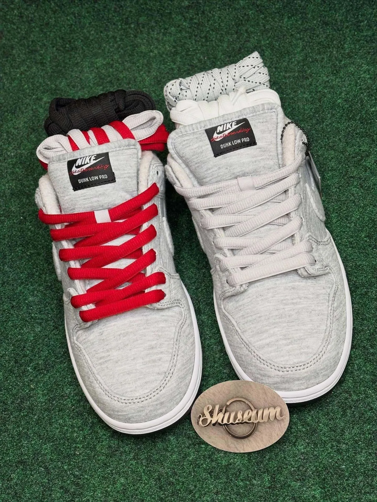 The Kirkland Signature x Nike SB Dunk Low is a no-nonsense Dunk that draws on the wholesale retailer’s low-key aesthetic. The sneaker’s upper is constructed from grey fleece, a nod to the material used for Costco’s iconic sweatshirts and sweatpants. Details like a padded fleece tongue and a lighter inner lining provide layers of depth to the simple design. Signature elements on the sneaker include the Kirkland Signature box logo stitched on the heel, a $1.50 hot dog graphic hidden under the Zoom Air cushioning, along with a tongue tag designed after Costco’s ubiquitous price labels.