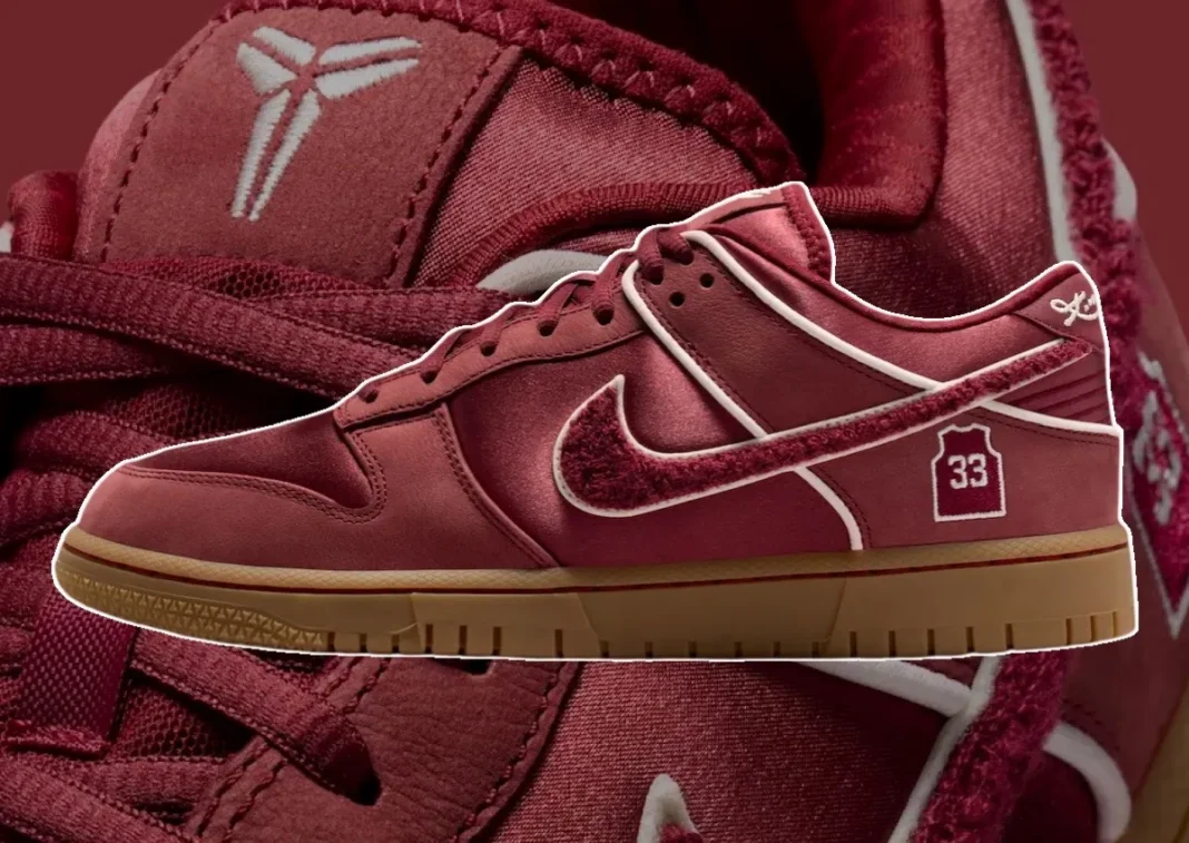The shoe features a mix of suede and satin materials across the upper, delivering a refined look that connects sport and storytelling. At the heel, Bryant’s Lower Merion jersey number “33” replaces standard branding, while his signature is stitched across the heel tab. The Kobe sheath logo also appears on the tongue, tying the Dunk Low directly to the Mamba identity.