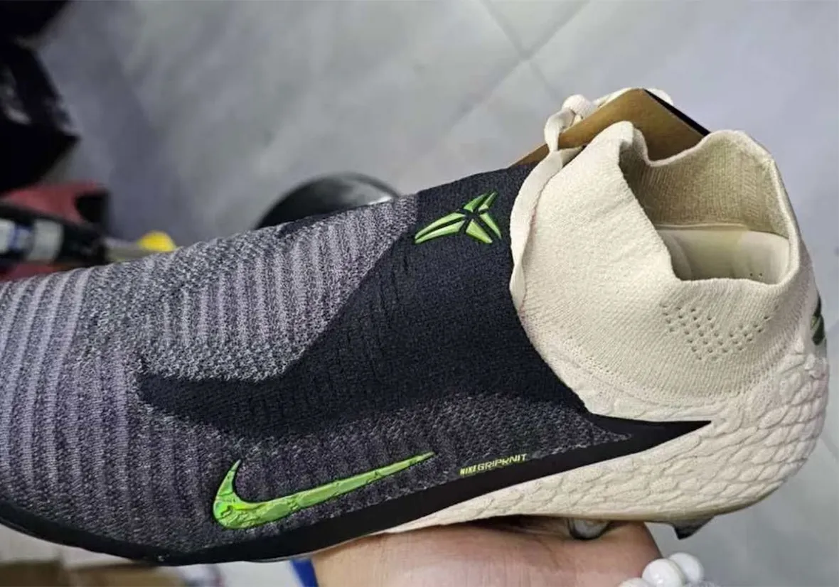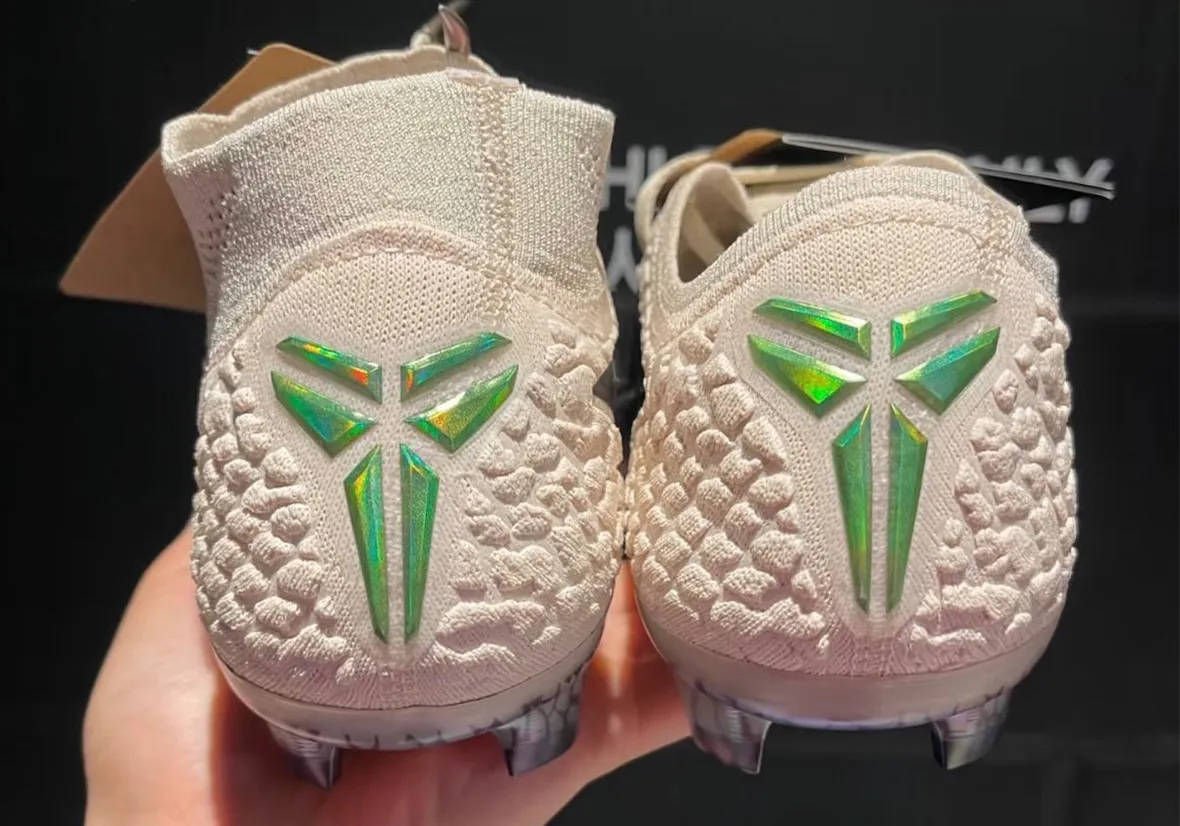 Recent leaks show two Phantom 6 builds—a high and a low—created as special editions honoring Kobe. The design uses a white, reptile-inspired texture that echoes past Mamba sneakers. Iridescent green hits stand out across the forefoot Swoosh, heel counter, and tongue logo. Each pair also includes custom “Mamba” insoles, giving the cleats a personal touch that feels earned rather than forced.
