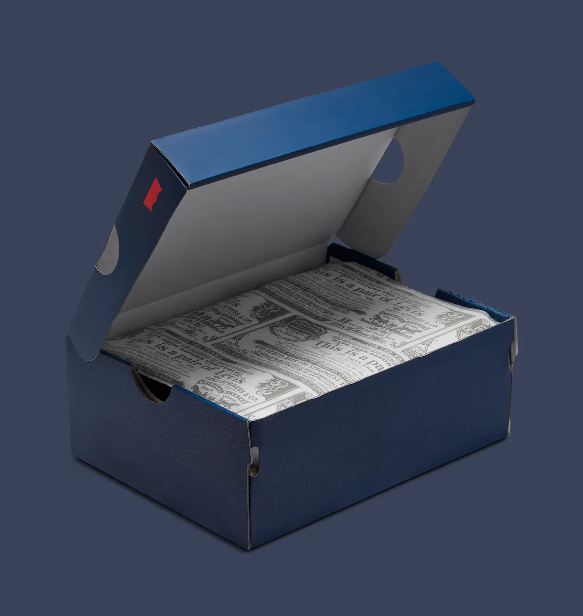 The shoe is outfitted in dark indigo denim, accented with black elephant print overlays and a white midsole for contrast. Small red details on the Levi’s tag confirm the collaboration.