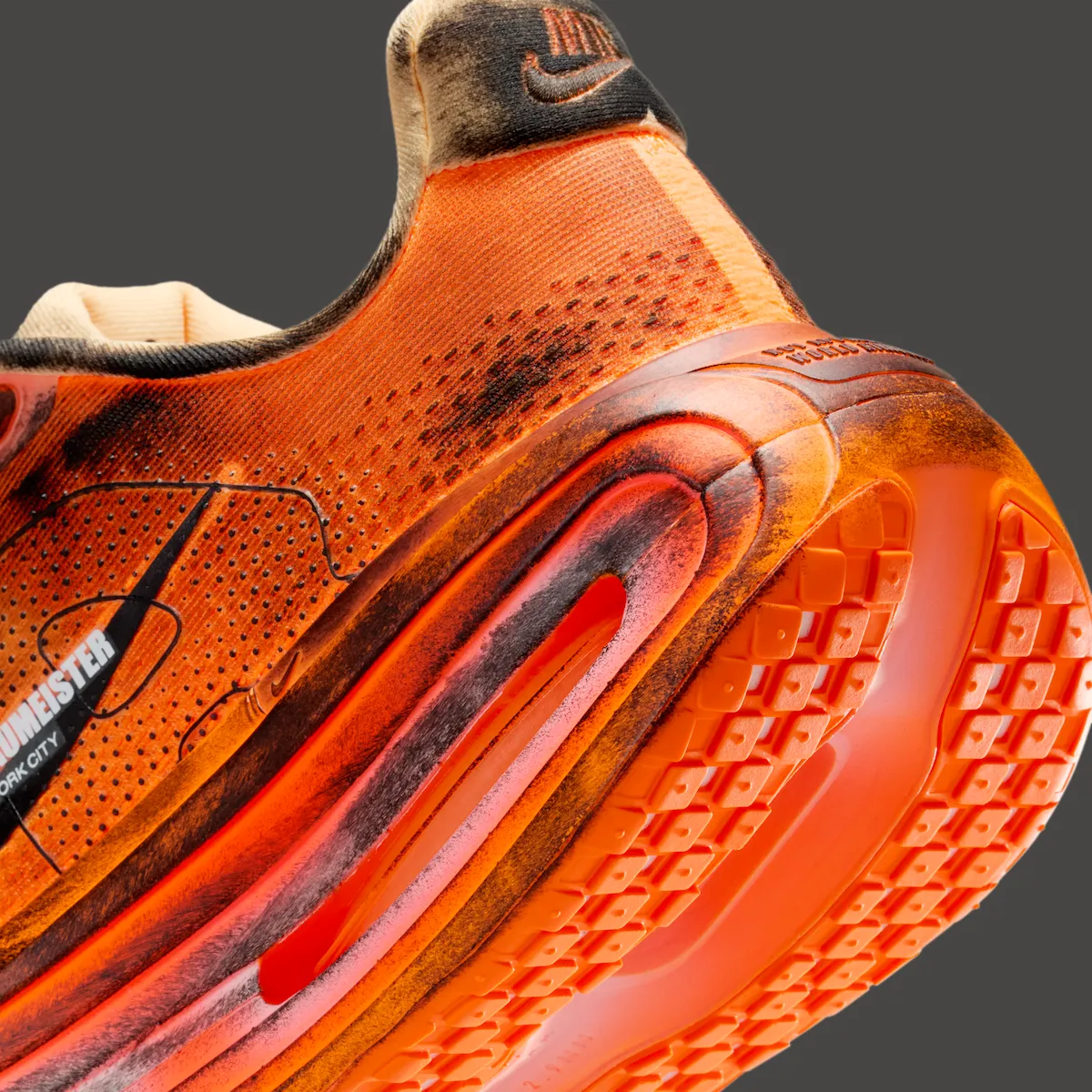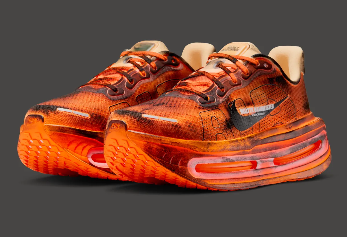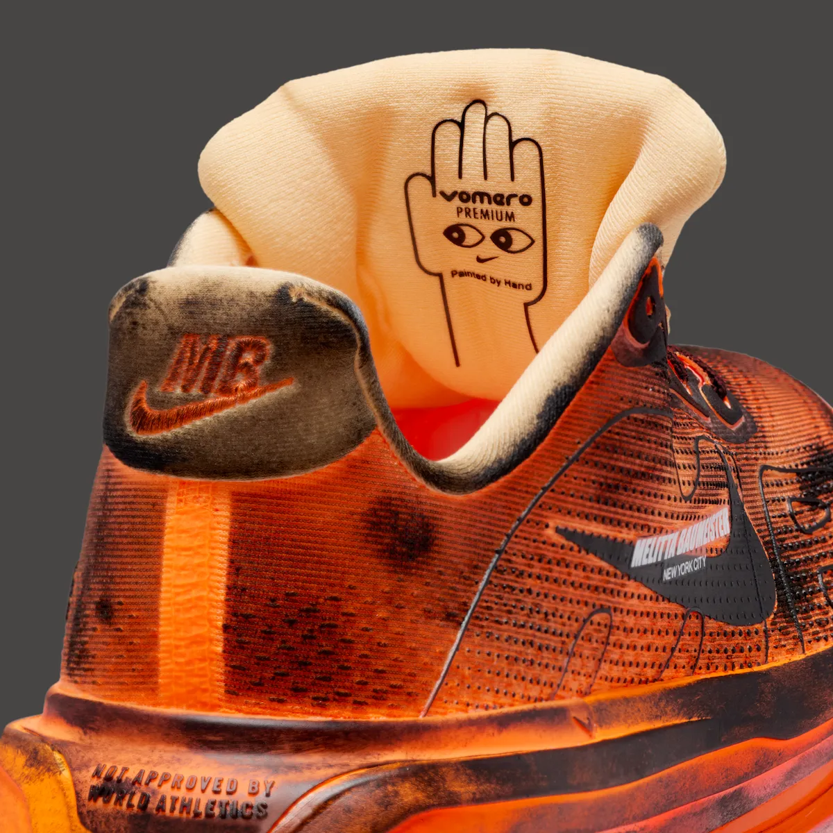 Baumeister riffs on the Vomero as a performance-couture mashup. The upper comes in a flaming orange hue, layered with heavy black distressing for a crinkled, heat-treated look on every panel. The midsole is similarly burnt, so the silhouette comes off as very intentional on being weathered rather than clean. It’s a bold shift for a model known for clean running lines.