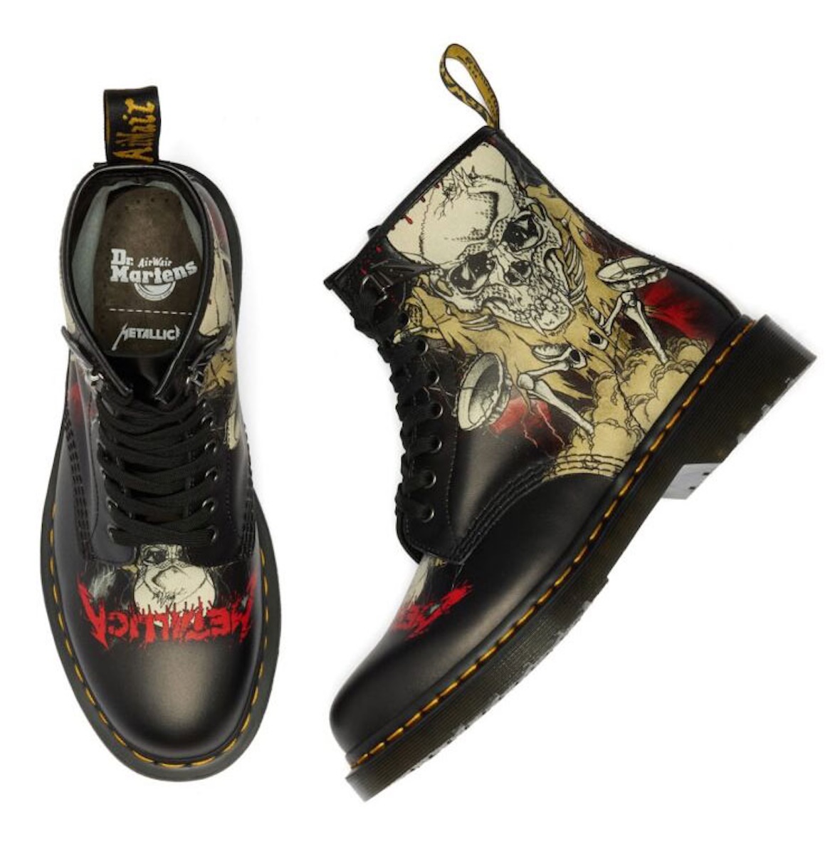 At the center of it, the Metallica x Dr. Martens collection arrives in two directions. One leans heavily into archival artwork, using Pushead’s graphics from the 1986 Damage Inc. and 1988 Damaged Justice tours on the 1460 boot and 1461 shoe. What once lived on posters and tees now carries across premium leather, giving the footwear a raw, collectible feel.