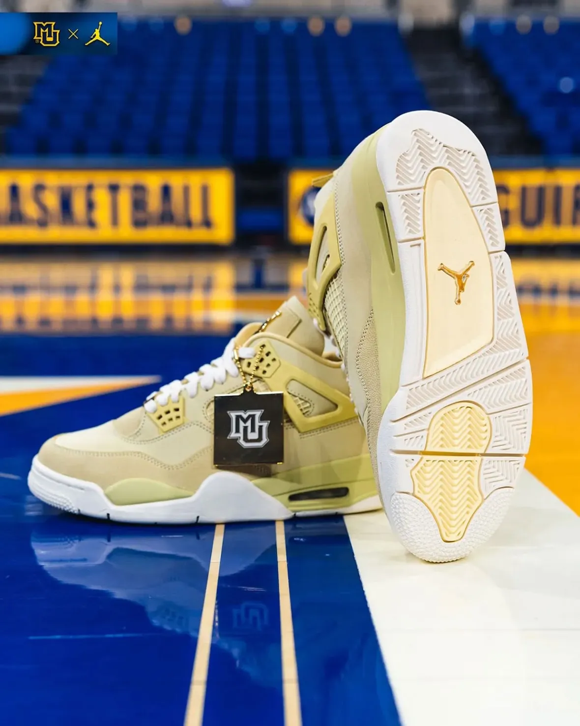 Following a recent appearance in the Nigel Sylvester x Air Jordan 4 “Cinnabar”, the six-time champion switched things up with a rare Air Jordan 4 “Marquette” PE. The player-exclusive pair, originally created for Marquette’s basketball program, showcases a refined mix of pale yellow nubuck and soft suede detailing. Gold Jumpman branding on the tongue and heel adds a premium finish, reinforcing the elevated look.