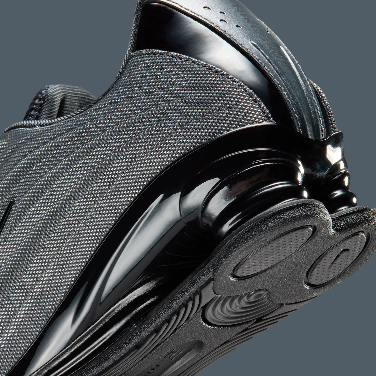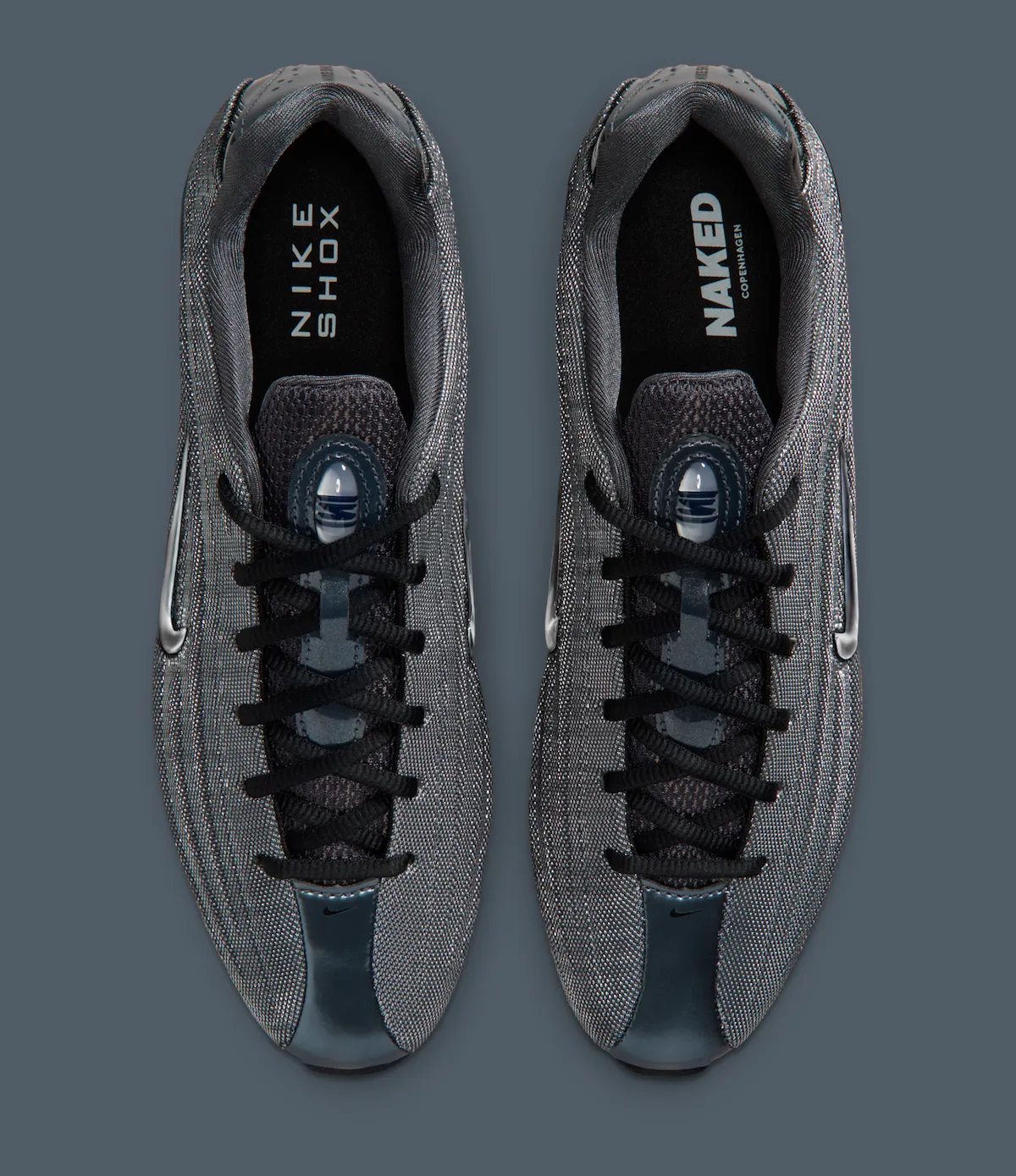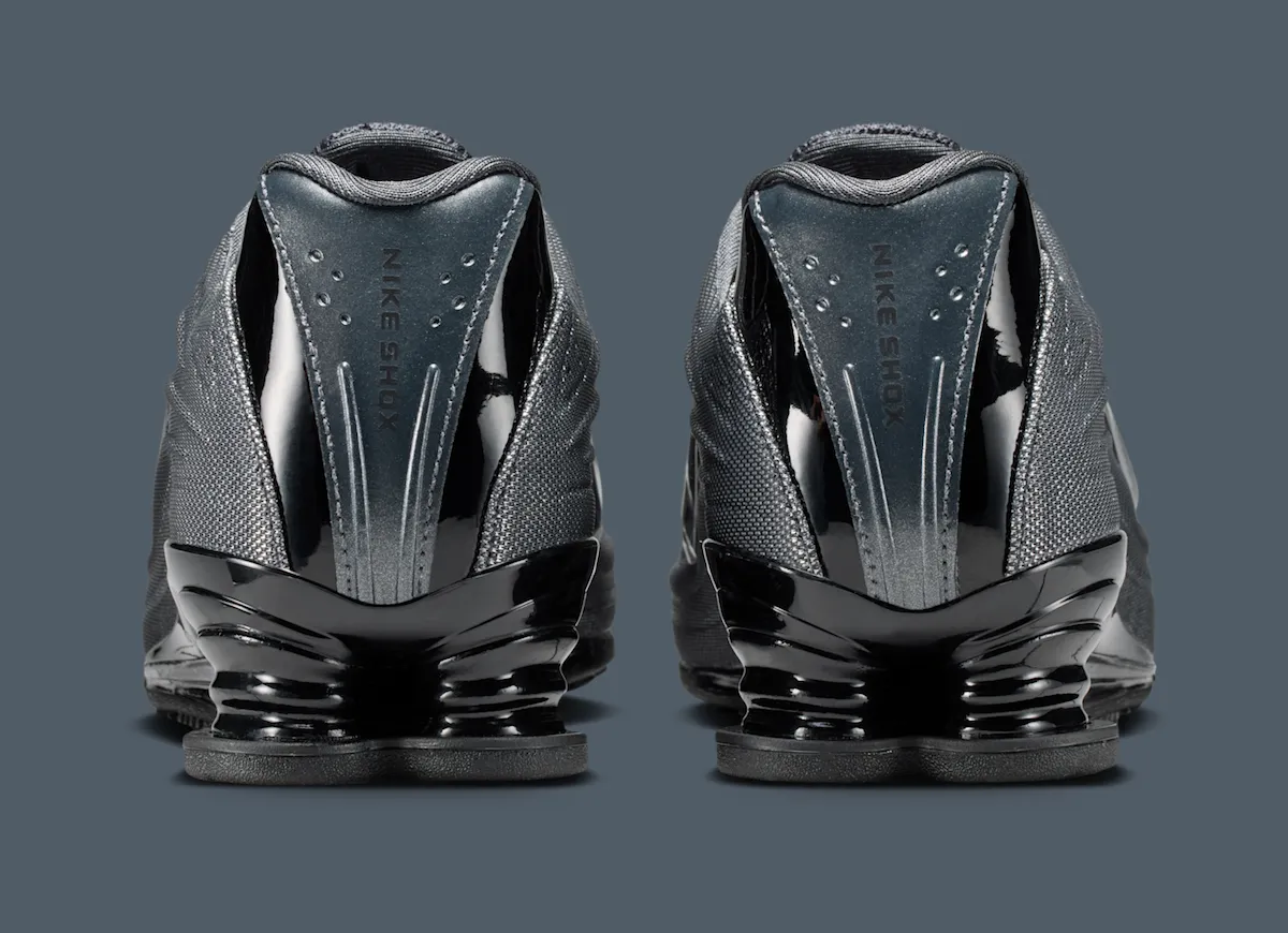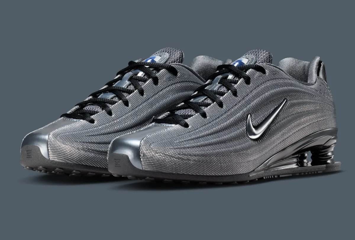 The collection leans into a dark, metallic palette influenced by Copenhagen’s rain-soaked streets. The Nike Shox Z keeps things clean and modern, featuring a Metallic Hematite mesh upper paired with black accents across the laces, heel, and signature Shox cushioning system.
