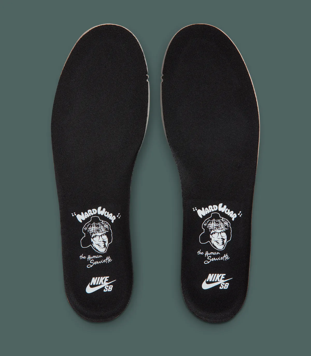 Underfoot, the translucent outsoles feature Nardwuar’s catchphrase—“Doot doola doot doo… Doot doo!”—in speech bubble graphics. Inside, special insoles showcase his face, “The Human Serviette” nickname, and Nike SB branding.